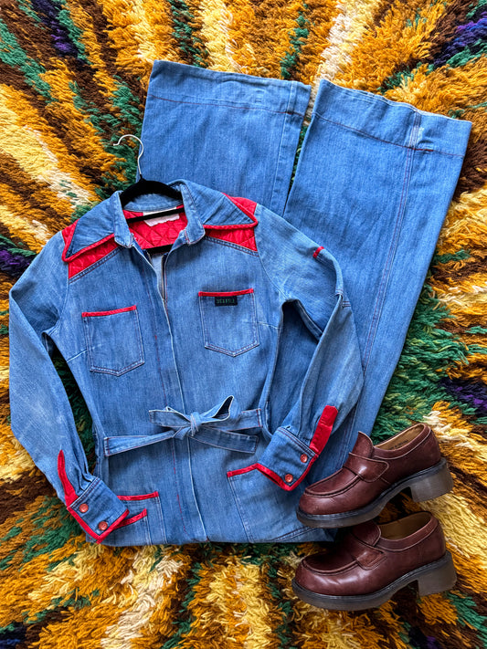 VINTAGE 1970S SCUTTLE COTTON DENIM WIDE LEG JUMPSUIT XS