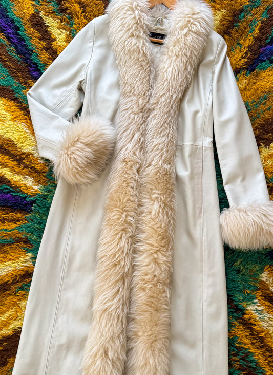 VINTAGE TOUGH RIDERS CREAM LEATHER SHEARLING PENNY LANE MAXI COAT M