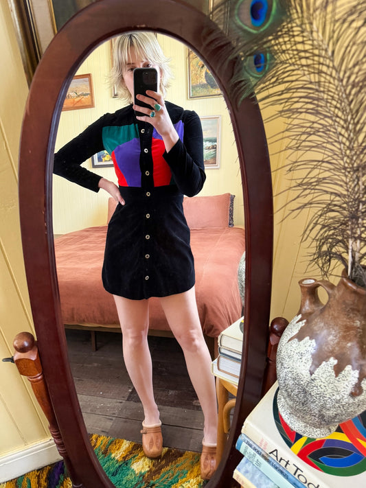 VINTAGE 1970S EMMA COTTON VELVET COLOUR BLOCK MINI DRESS S