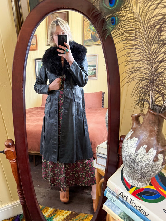 VINTAGE 1970S BLACK LEATHER PENNY LANE LONG SHEARLING COAT S