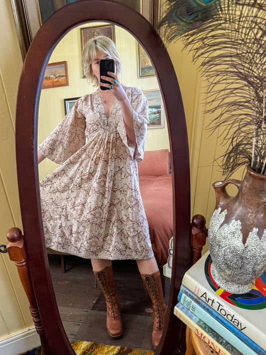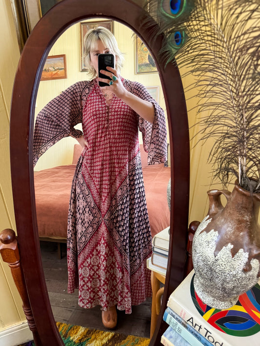 VINTAGE 1960S INDIA IMPORTS COTTON GAUZE BLOCK PRINT MAXI KAFTAN DRESS ONE SIZE