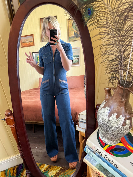 VINTAGE 1970S VADIM AUSTRALIAN COTTON DENIM WIDE LEG JUMPSUIT S/M