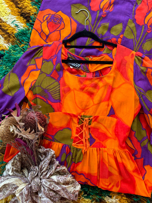 VINTAGE 1970S SNAZZI COTTON FLORAL PRINT CORSET MAXI PRAIRIE DRESS S/M