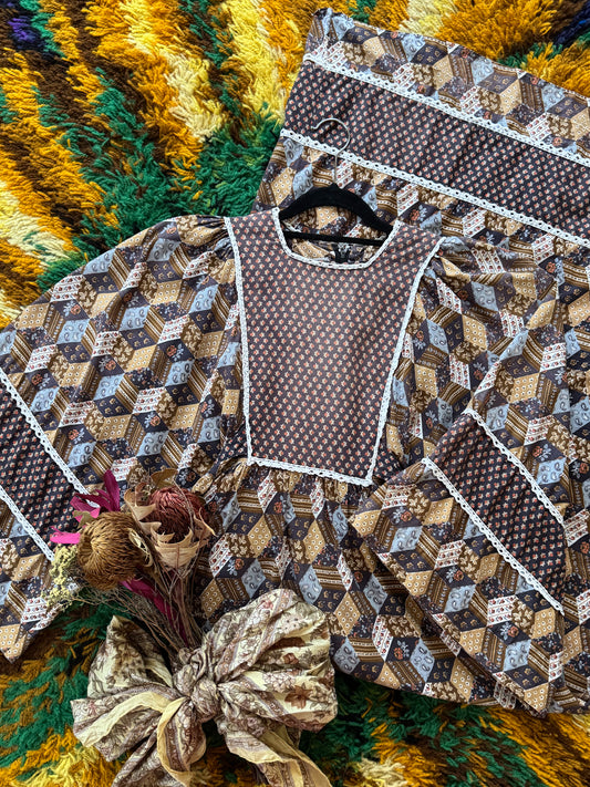 VINTAGE 1970S COTTON PATCHWORK PRINT KIMONO SLEEVE MAXI DRESS S