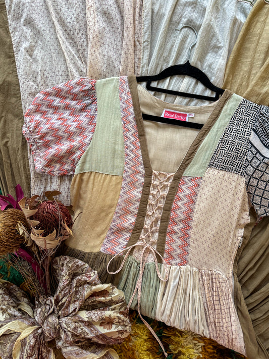 VINTAGE 1980S RENE DERHY INDIAN COTTON GAUZE PATCHWORK LACE UP MIDI DRESS XS/S