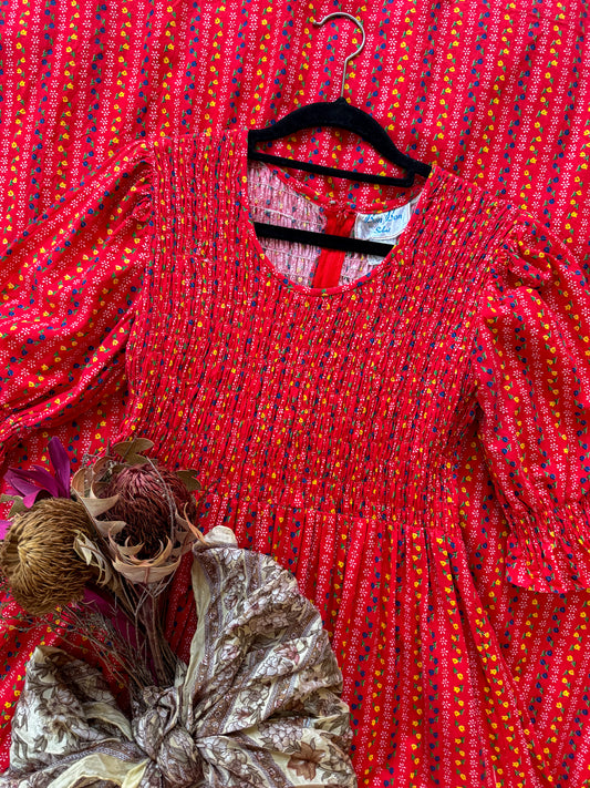 VINTAGE 1970S BON BON COTTON SHIRRED BUST FLORAL PRINT MAXI PEASANT DRESS M/L