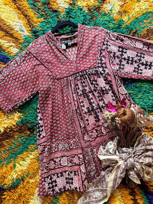 VINTAGE 1970S CHELSEA GIRL INDIAN COTTON BLOCK PRINT TUNIC TOP S/M