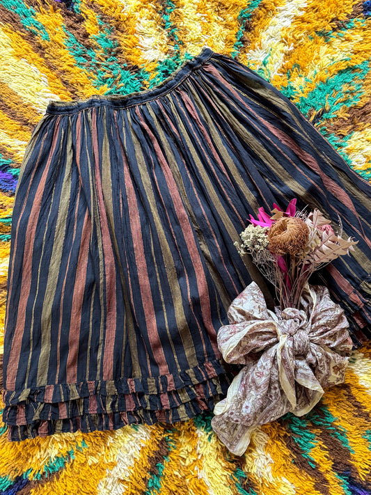 VINTAGE 1970S ADINI INDIAN COTTON GAUZE LUREX RUFFLE MIDI SKIRT M/L/XL