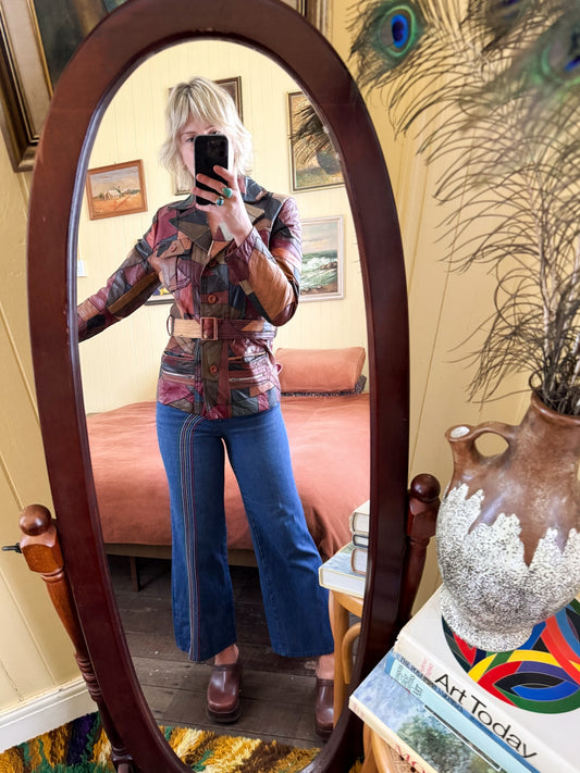 VINTAGE 1970S KOREAN PATCHWORK LEATHER SAFARI BELTED JACKET M
