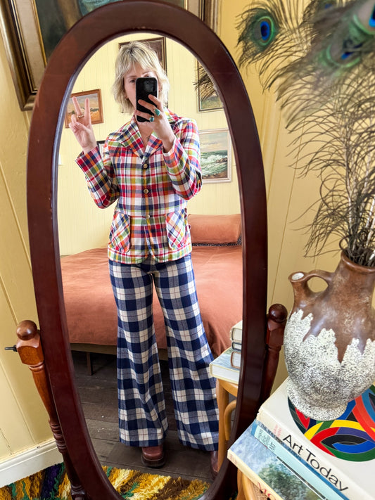 VINTAGE 1970S VIRGO COTTON PLAID DAGGER COLLAR BLAZER JACKET M