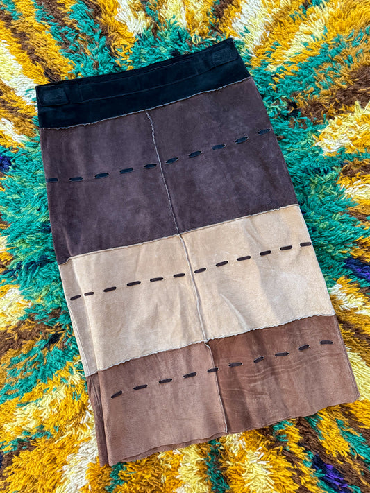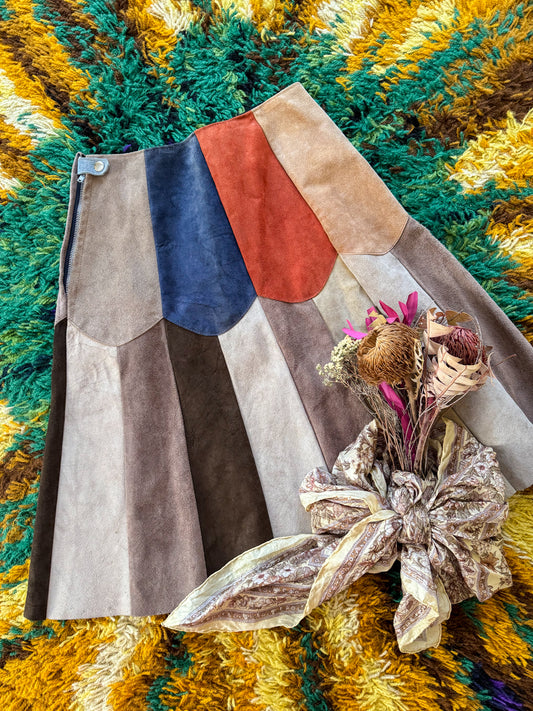VINTAGE 1970S SUEDE LEATHER PATCHWORK REVERSIBLE MIDI SKIRT M