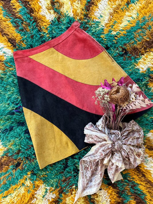 VINTAGE 1970S SUEDE LEATHER PANELLED KNEE LENGTH SKIRT XS/S
