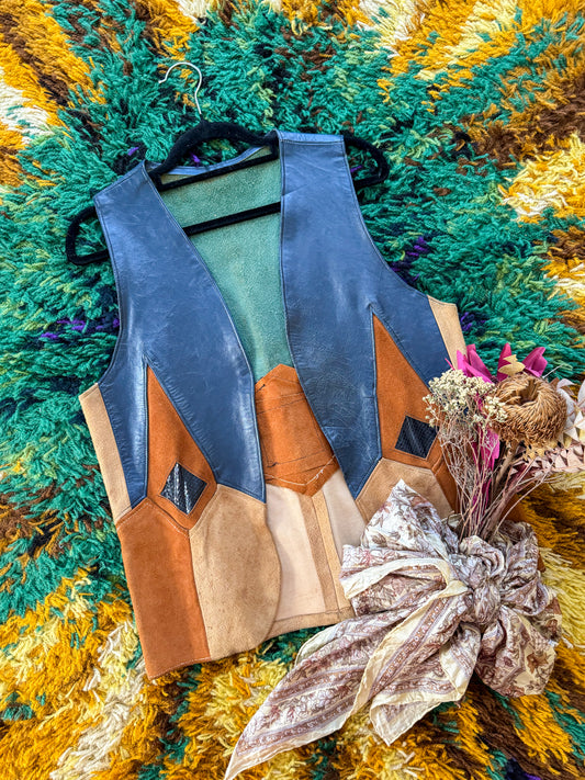 VINTAGE 1970S PATCHWORK LEATHER AND SUEDE WAISTCOAT VEST S/M