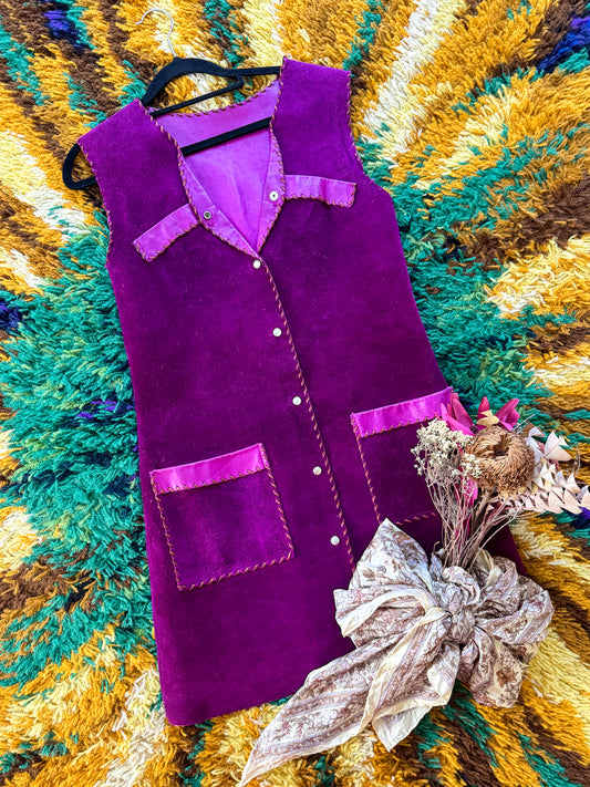 VINTAGE 1970S PURPLE SUEDE LEATHER LONGLINE VEST MINI DRESS XS/S