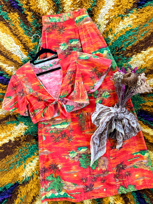 VINTAGE 1970S COTTON HAWAIIAN PRINT TWO PIECE CROPPED TOP + MAXI WRAP SKIRT SET S/M