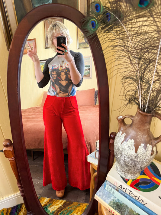 VINTAGE 1970S ST CHARLES RED VELVET WIDE LEG FLARE PANTS S/M