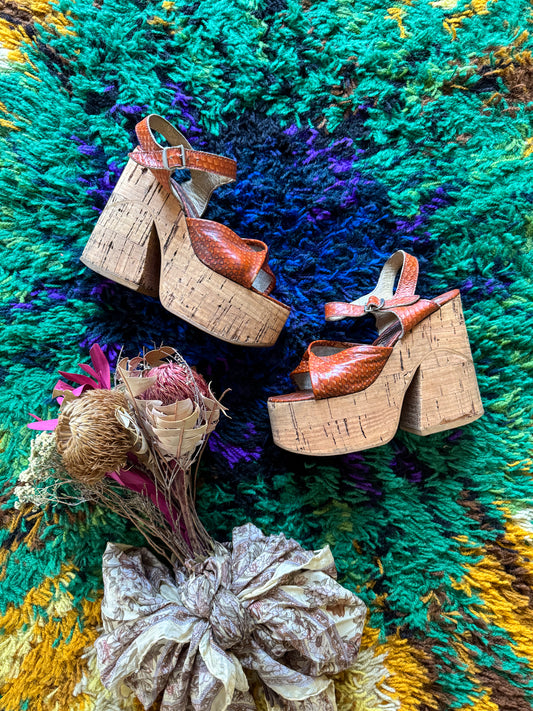 VINTAGE 1970S TAN LEATHER SNAKE EFFECT CORK SUPER PLATFORM SANDALS 6/37
