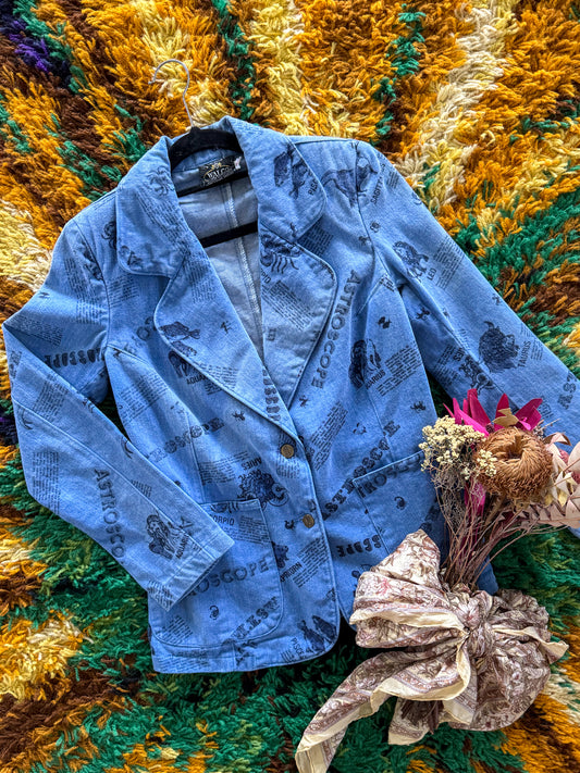 VINTAGE 1970S WALCO COTTON DENIM ASTROSCOPE PRINT BLAZER JACKET S
