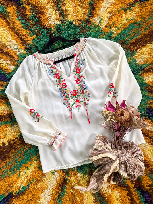 VINTAGE 1980S HUNGARIAN EMBROIDERED LONG SLEEVE PEASANT BLOUSE M