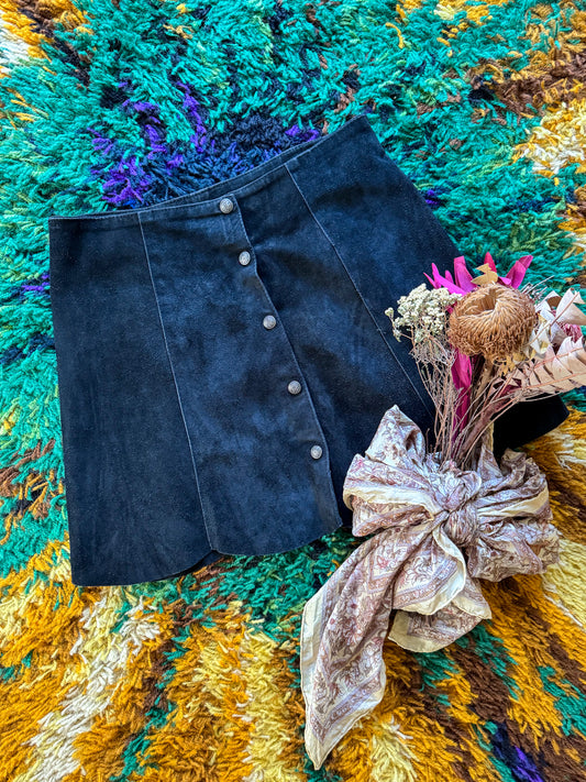 VINTAGE 1990S SUEDE LEATHER PANELLED BUTTON THROUGH MINI SKIRT M/L