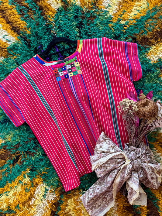 VINTAGE GUATEMALAN EMBROIDERED STRIPED COTTON HANDLOOM HUIPIL TOP S/M