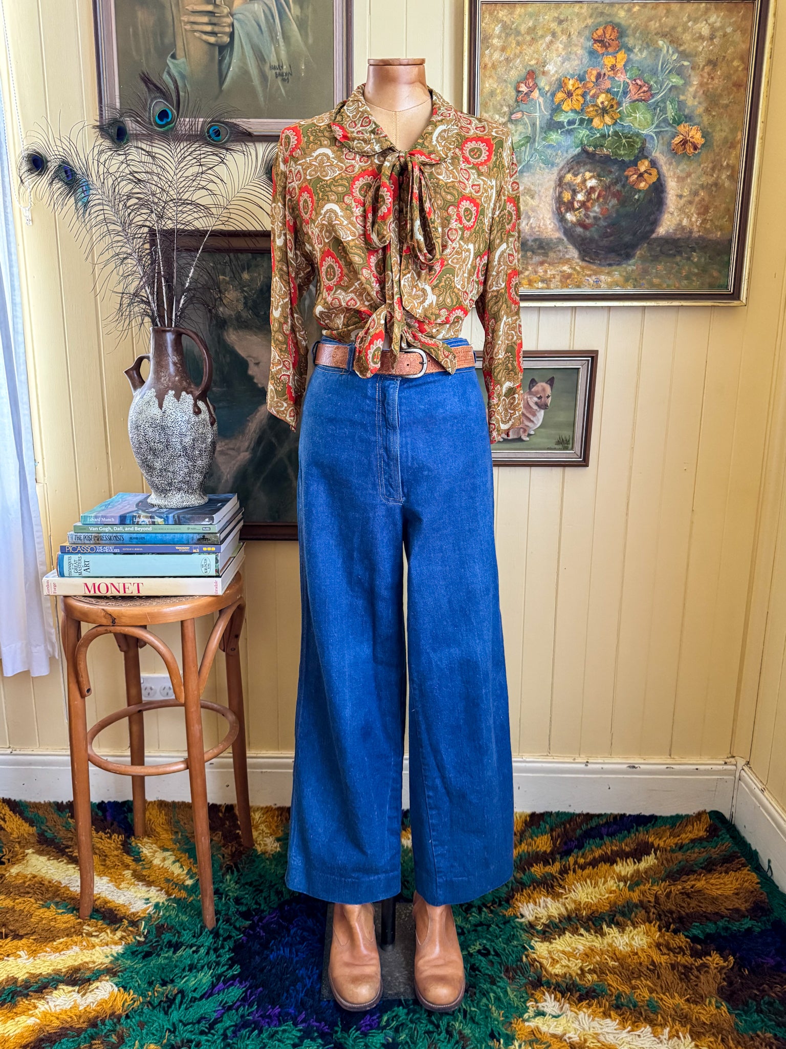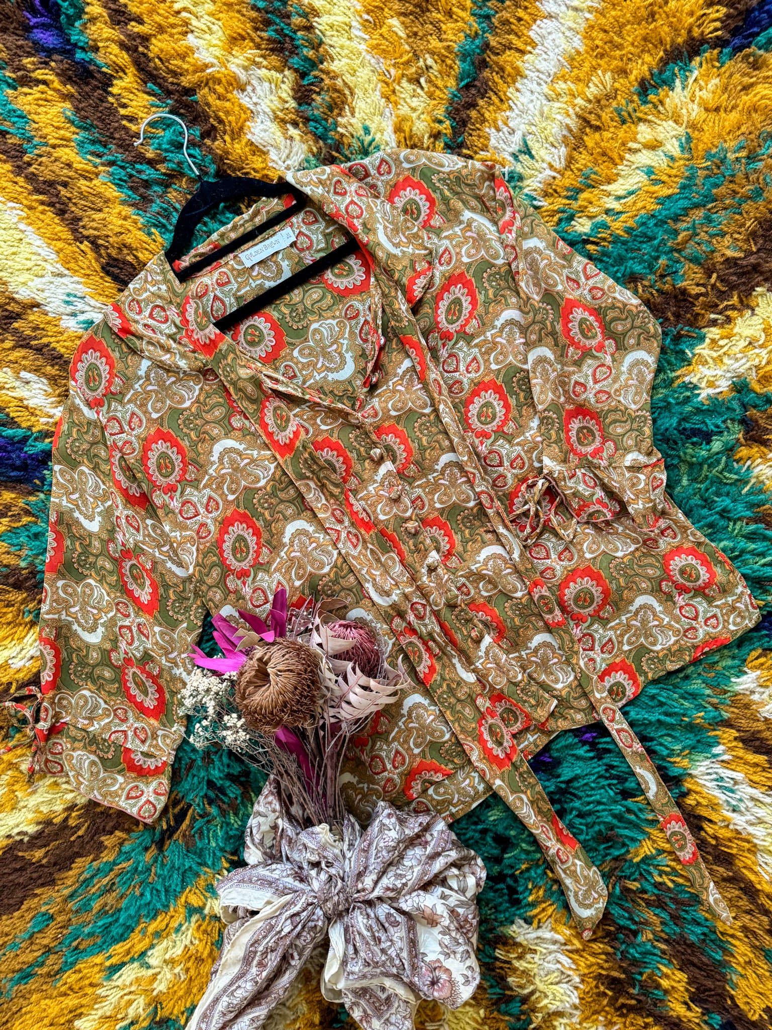 This sweet lil blouse is by one of my favourite slow and considered designers, Golden Brown the Label. Made in a beautifully sheer silk fabrication with a lovely drape, all adorned in the prettiest autumnal toned paisley print. She features an oversized tie on the deep v-neck, is button through in design with a floaty hem and three quarter sleeves with button cuffs.