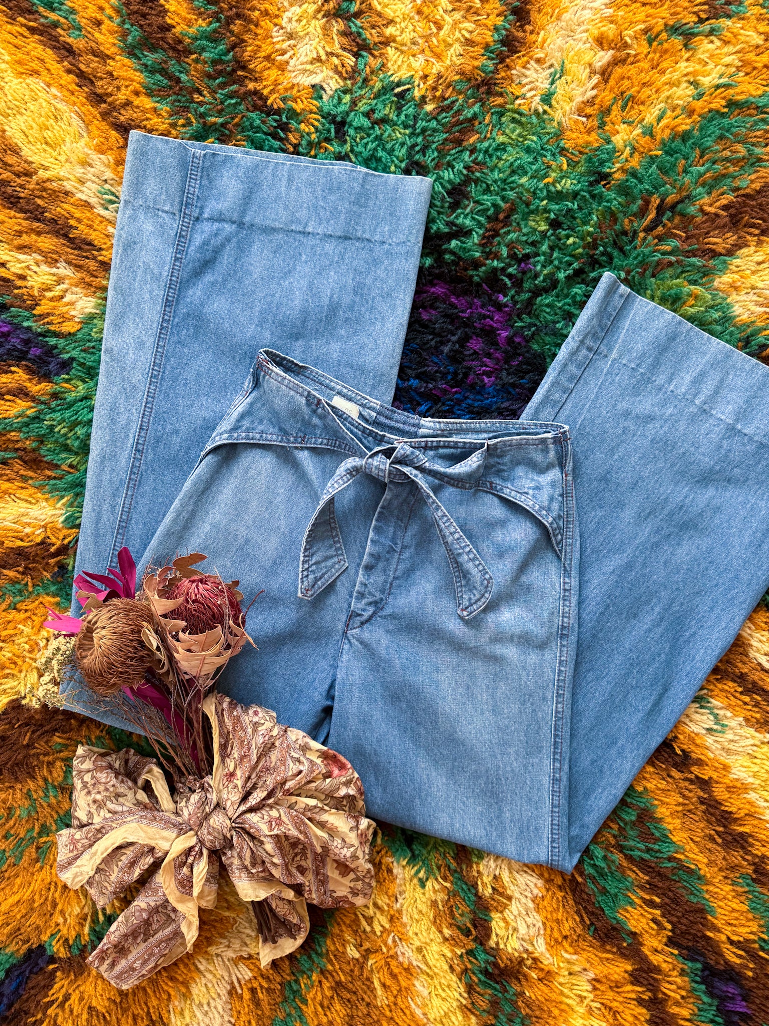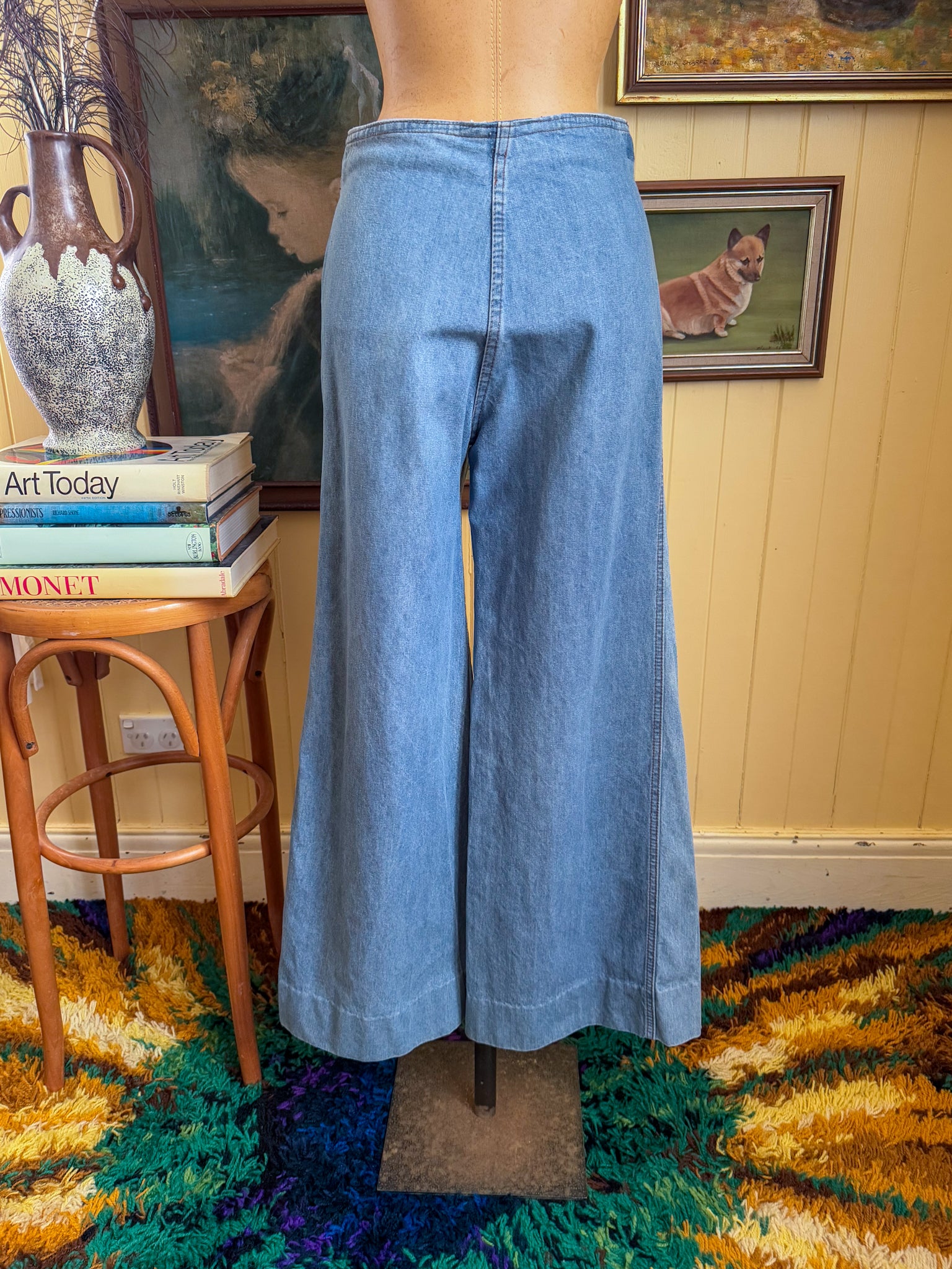 These are a fabulous pair of 1970’s denim jeans from iconic Australian denim label Amco, in a mid weight cotton denim in a gorgeous light blue wash. They have a high waist with unique wrap belt tie detail, front pockets, button and zip fastening, a plain butt and are fitted around the butt and hips and flares out into a flattering wide leg.
