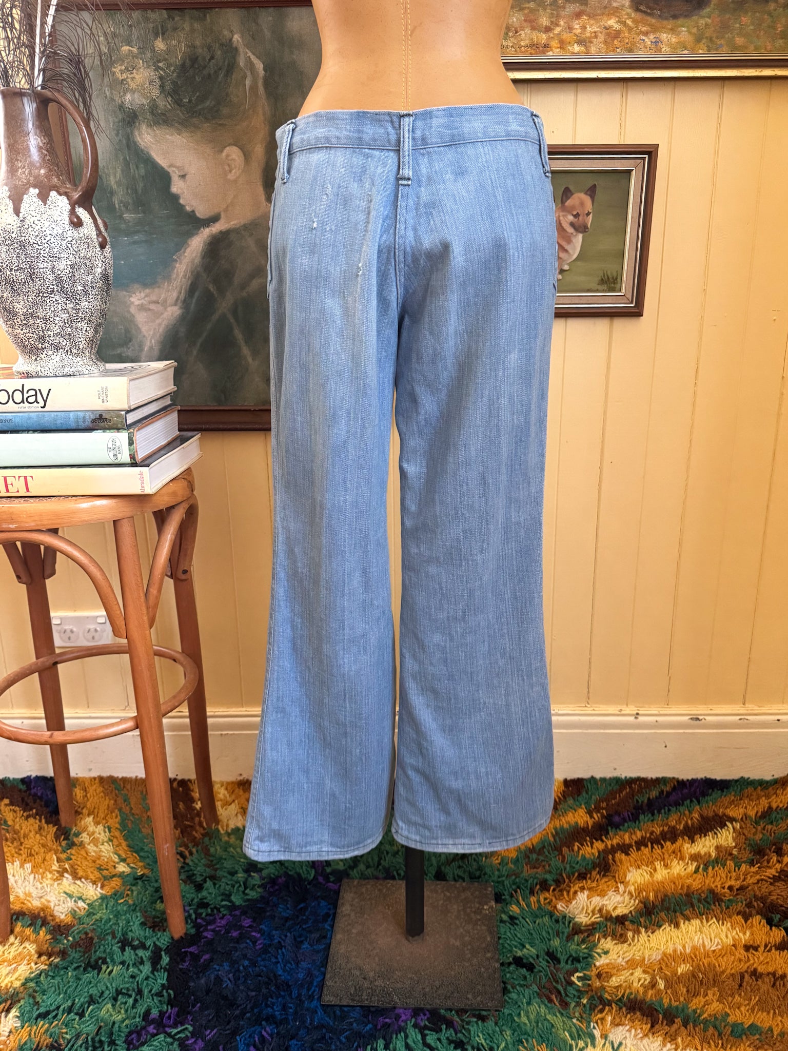 Okay so these are one of the grooviest pairs of jeans I have found in a long while. Crafted in a soft cotton no-stretch denim in a gorgeous light blue wash, these Male Slacks zip through jeans are what 1970’s denim dreams are made of. These insane jeans feature a low/mid waist, zip through the front of each leg with contrast black zips with large pulls, have studded detail on either side of the hip, are fitted around the butt and hips and then kick out into a flared, slightly cropped leg. Just perfection.