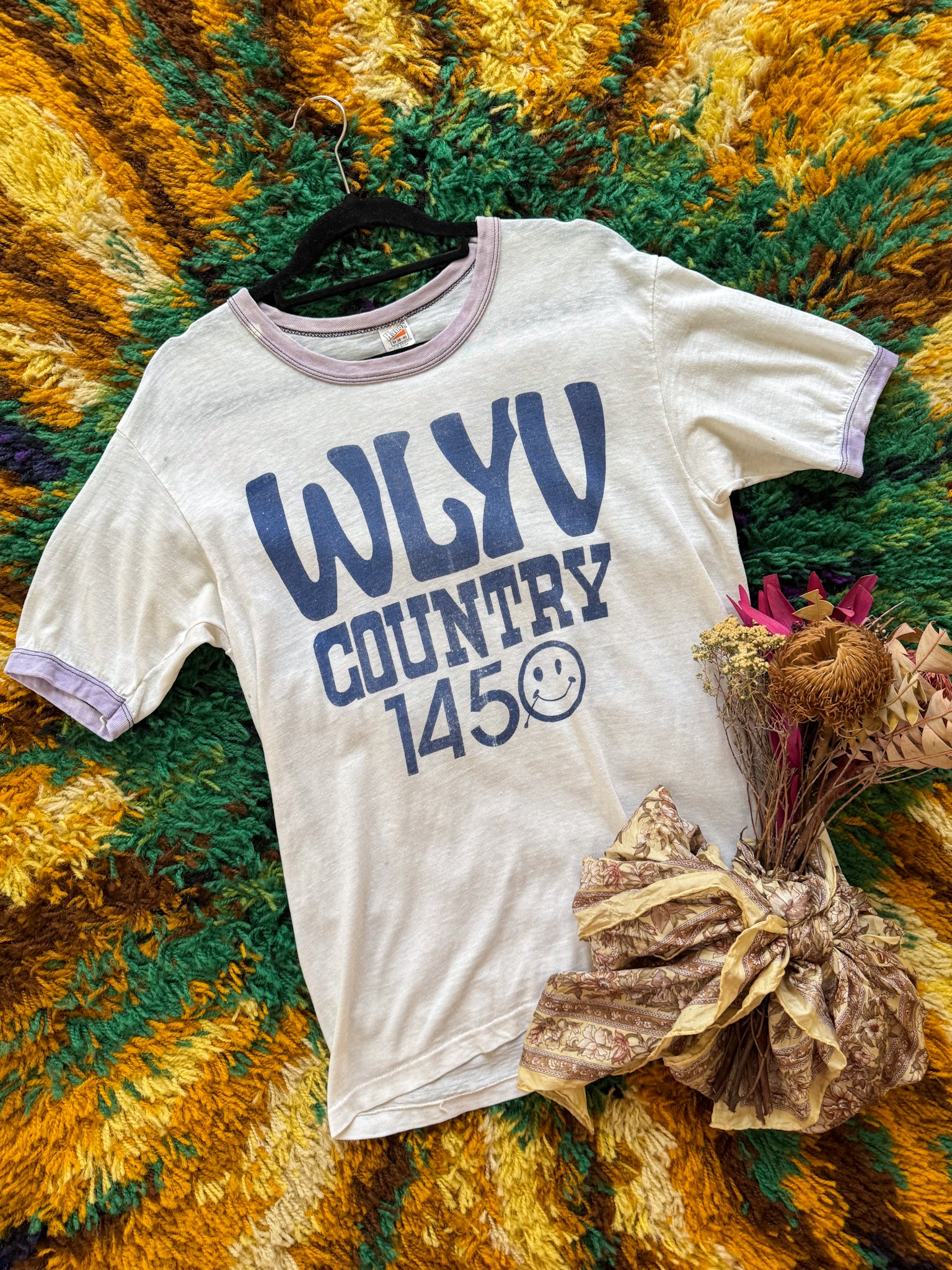 A super groovy threadbare single stitch American vintage WLYV Country Radio tee, from an Ohio radio station. The tee features a print on both the front and back, contrast neck binding and short sleeves.