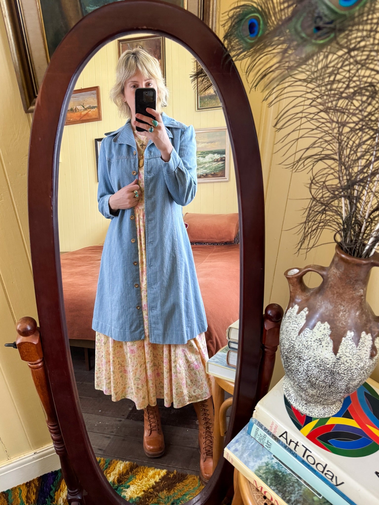 VINTAGE 1970S CHAMBRAY COTTON DENIM EMBROIDERED LONGLINE JACKET S/M