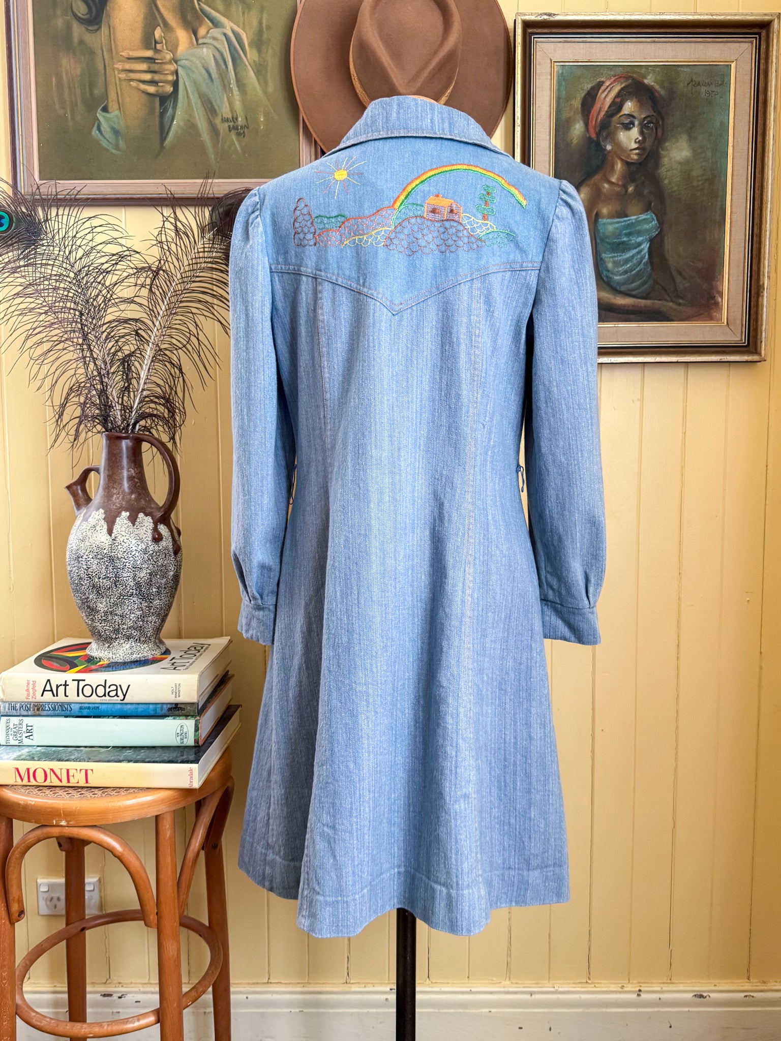 Introducing this groovy denim number, straight from the 1970s to you. Crafted in a mid weight cotton denim fabrication in a wonderfully washed blue chambray hue, this dreamy piece features the sweetest rainbow embroidery detail across the back shoulders. A dagger collar, metal button fastenings, and supper flattering body skimming silhouette complete the look.