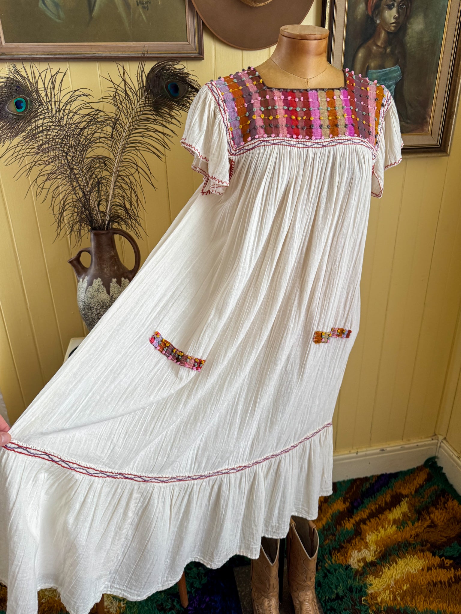 VINTAGE 1970S COTTON CHEESECLOTH EMBROIDERED MIDI SUNDRESS S/M/L