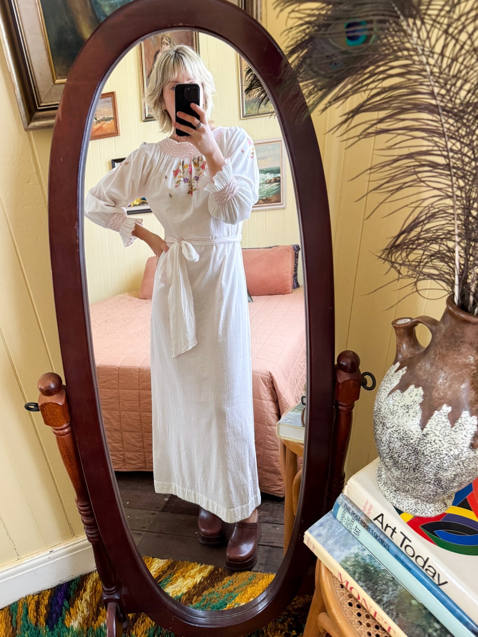 VINTAGE 1970S COTTON CHEESECLOTH EMBROIDERED PEASANT MAXI DRESS S/M