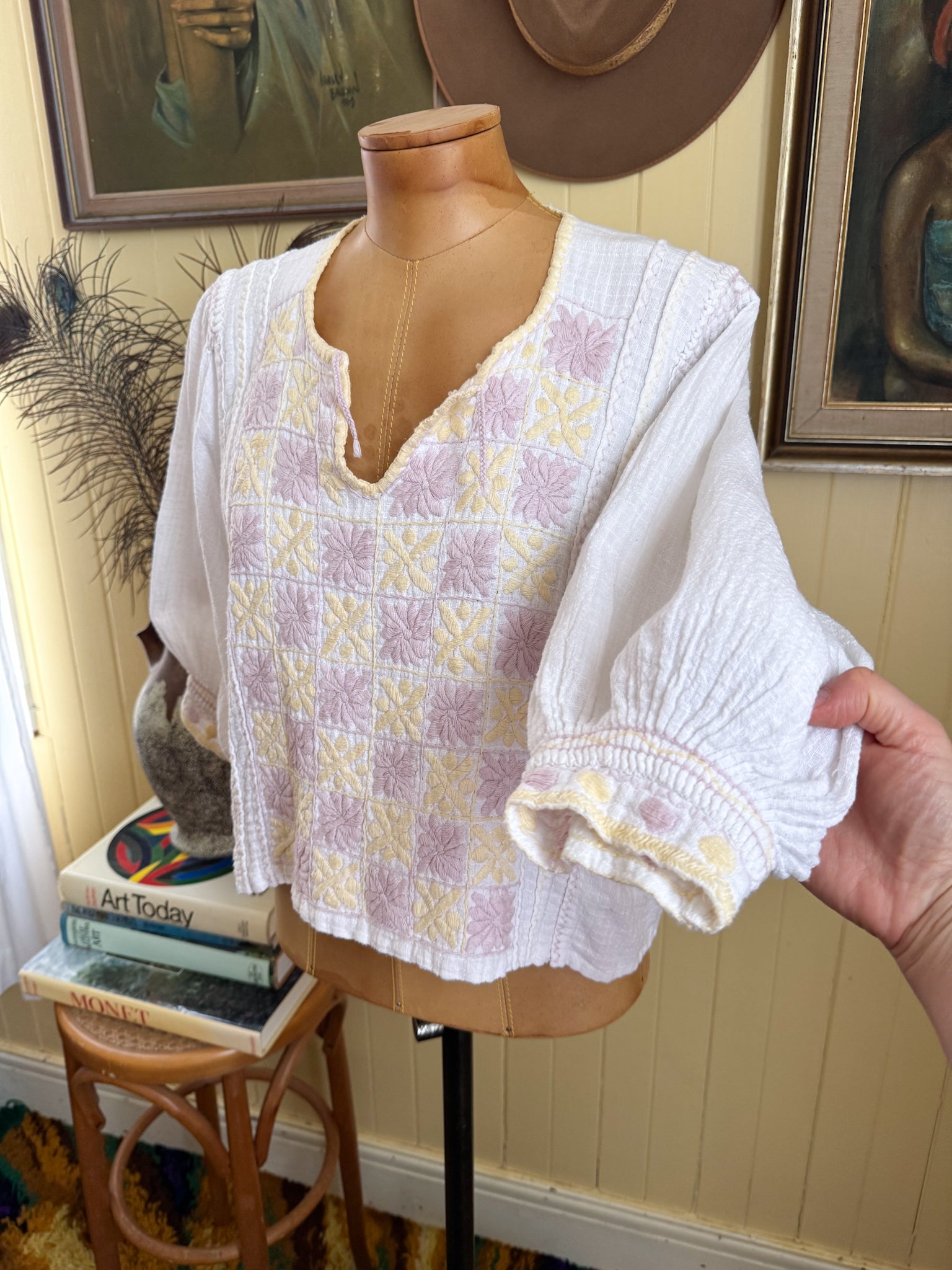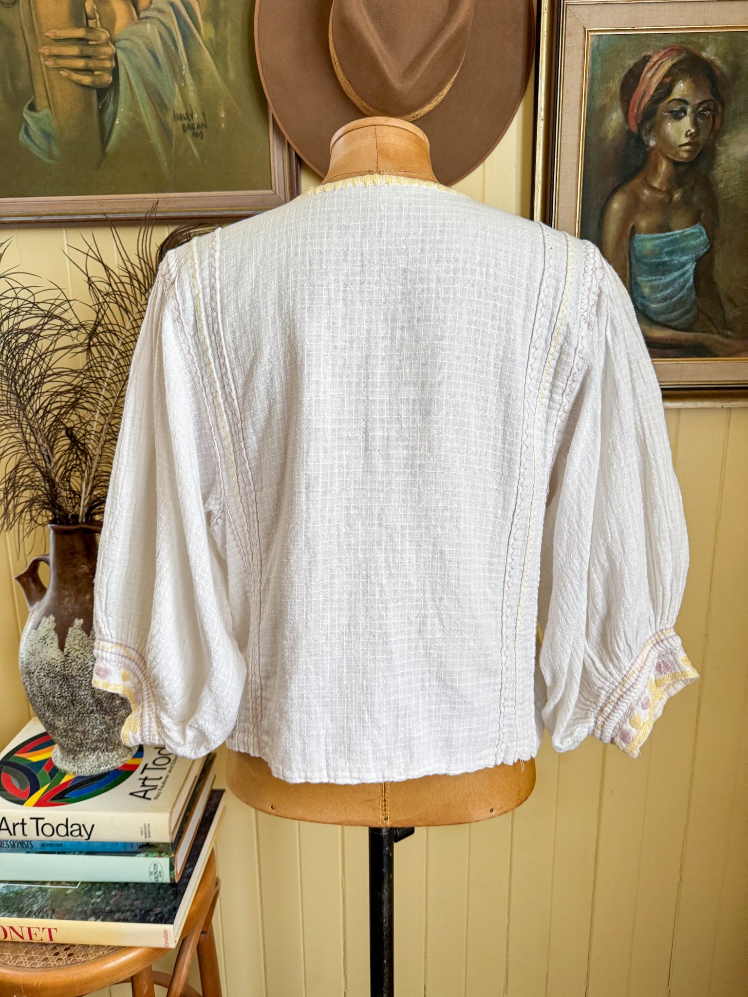 VINTAGE 1970S COTTON FLORAL EMBROIDERED BALLOON SLEEVE FOLK BLOUSE M/L