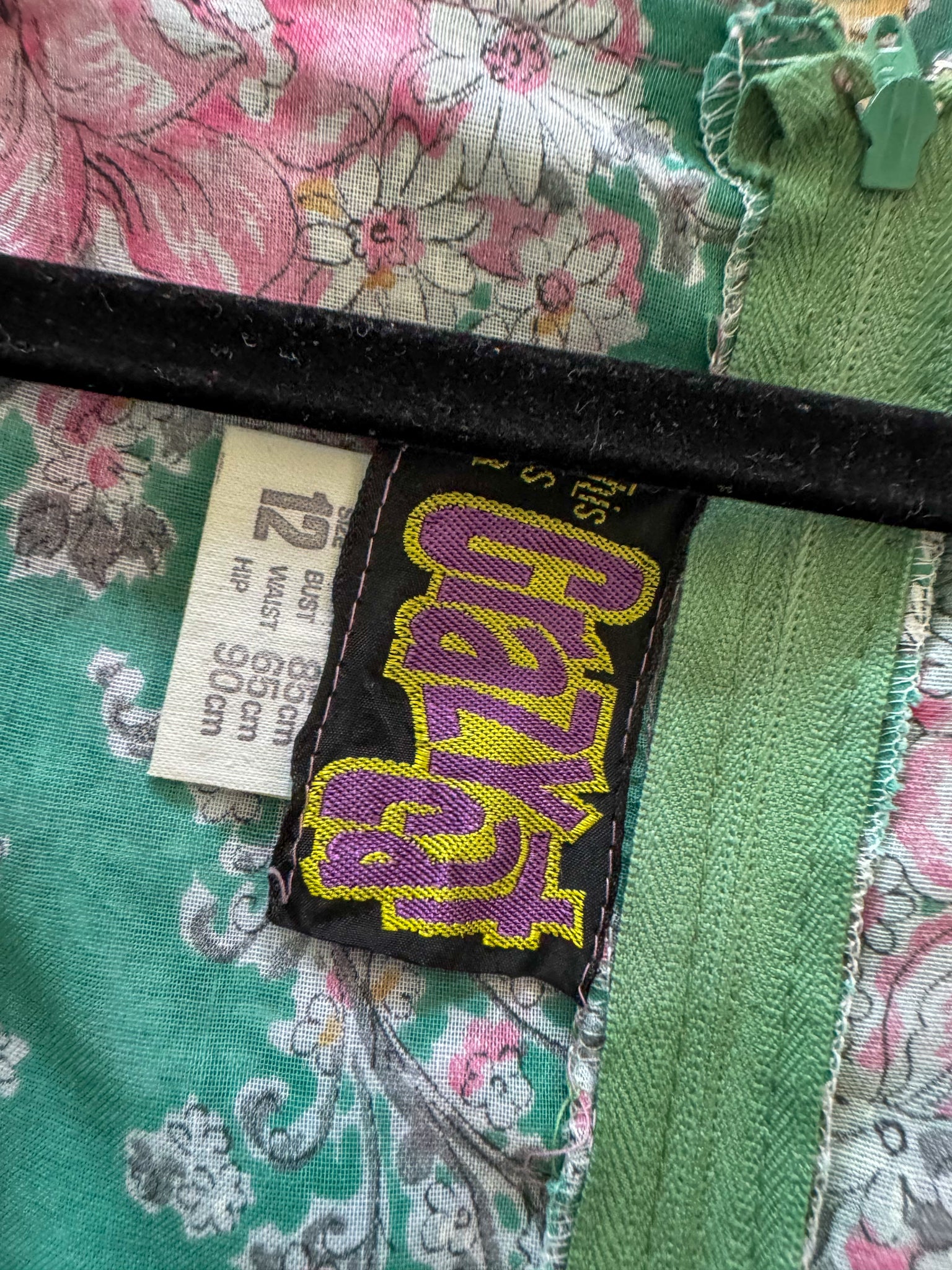 An exquisite example of cottage core chic, straight from the Victoriana revival in the 1970s. This ever so pretty prairie dress is by designer label Crazy Cat in the most gorgeous pale mint green floral poly/cotton. The dress features the most beautiful balloon sleeves with slim buttoned cuffs, a square neck with pleated bust and falls to an effortless maxi length. A waist tie allows for added definition, and a back zip allows for entry.