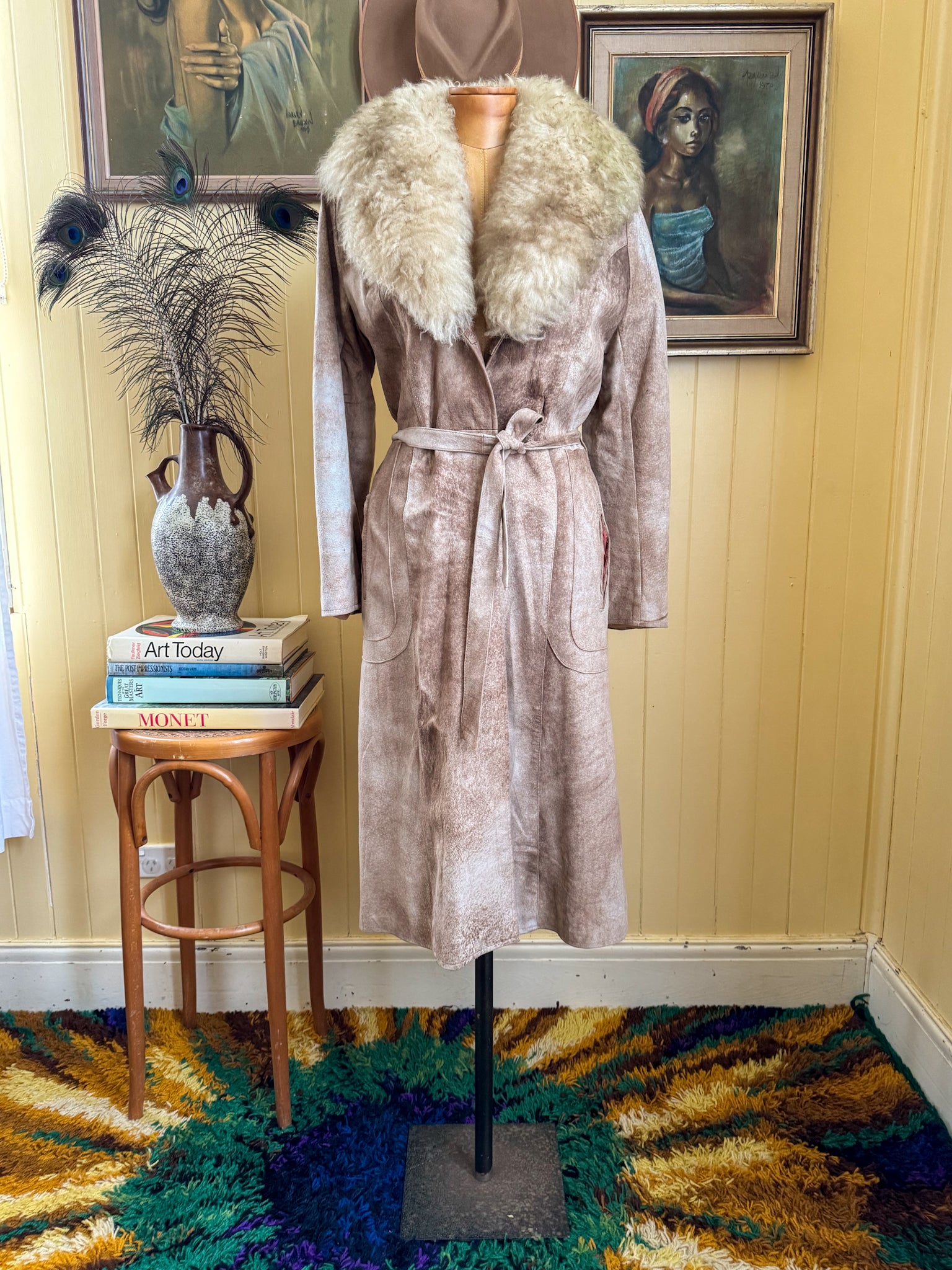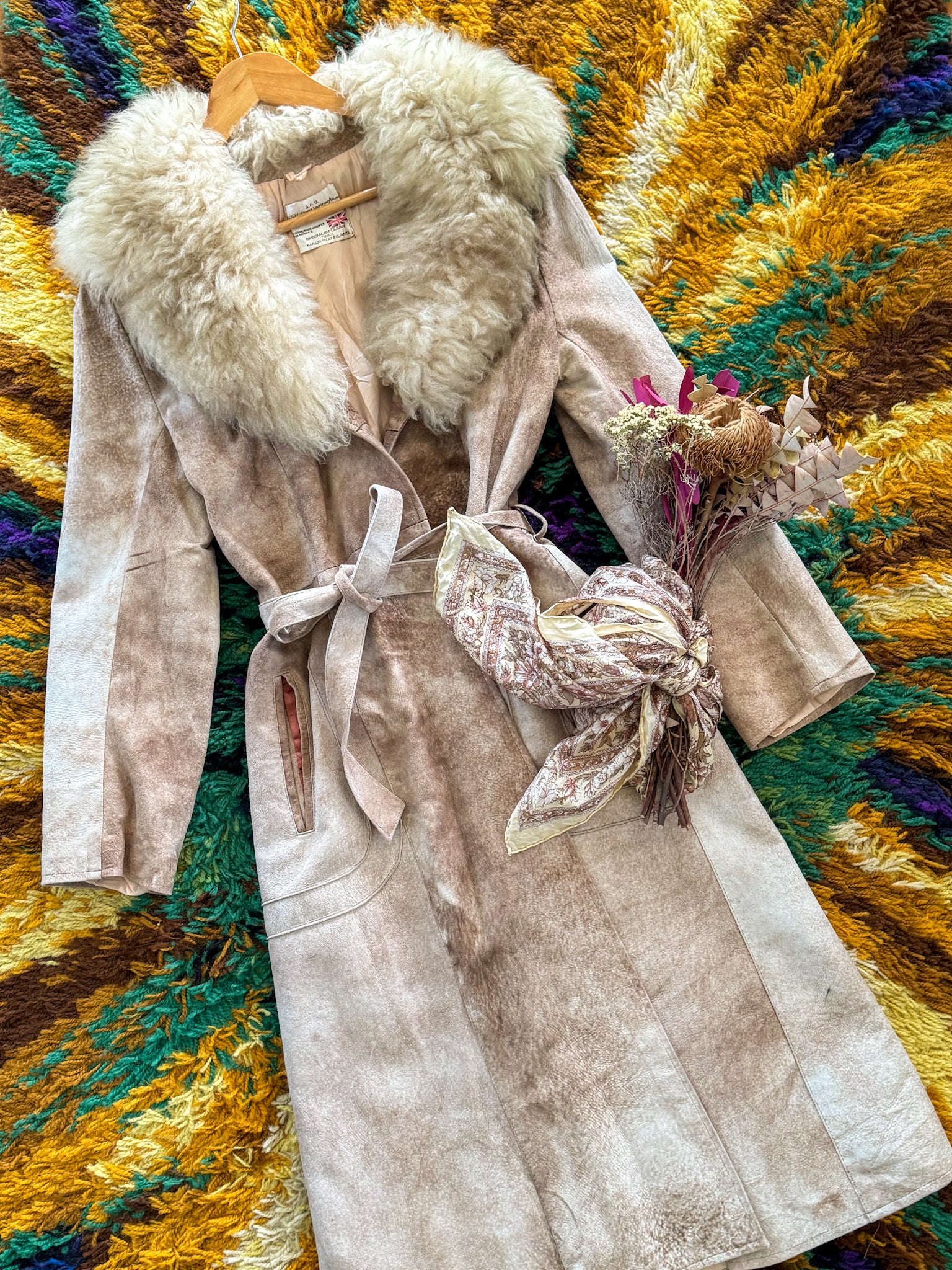 VINTAGE 1970S ENGLISH NATURAL SUEDE SHEEPSKIN LONGLINE WRAP COAT S/M