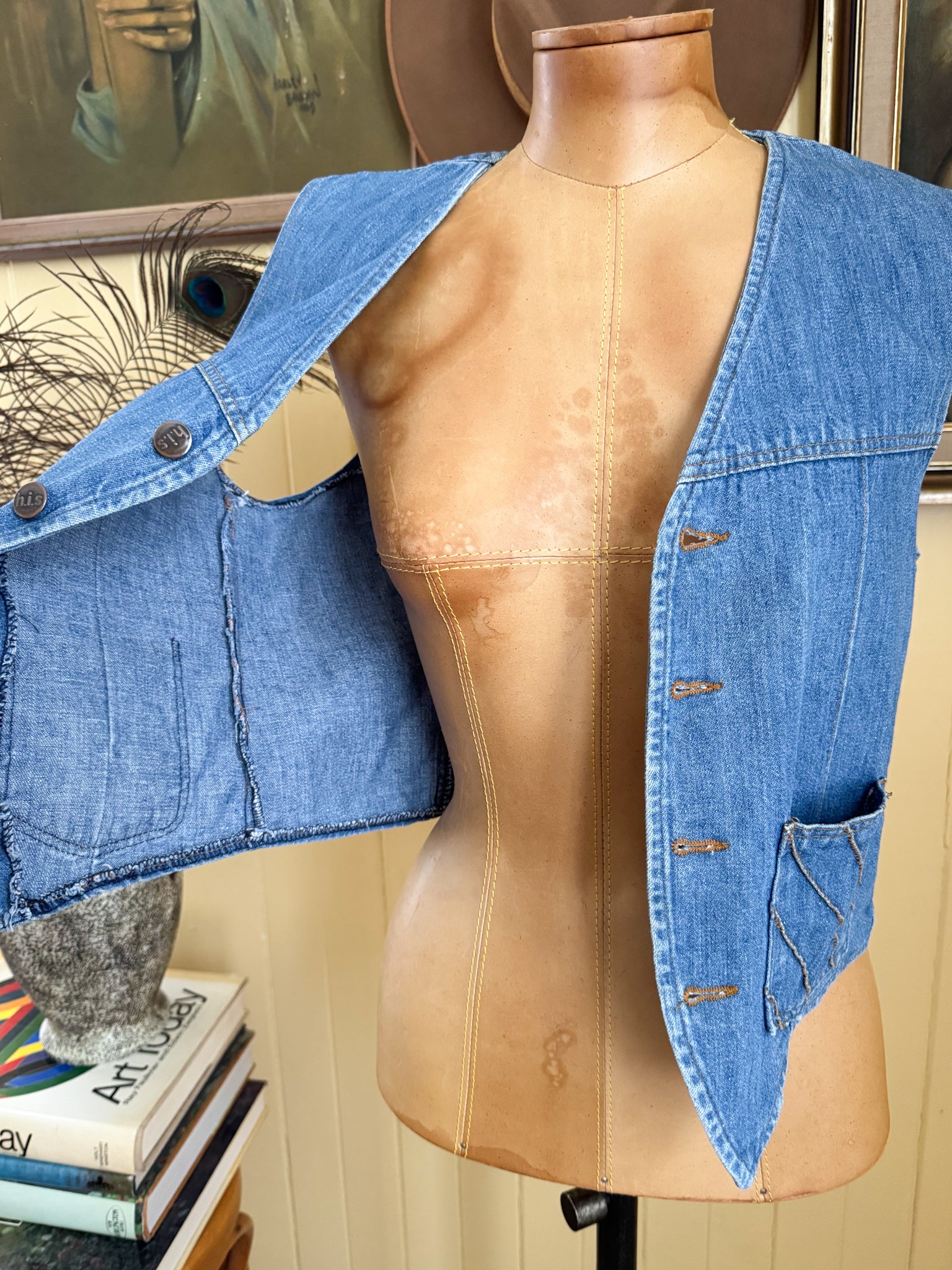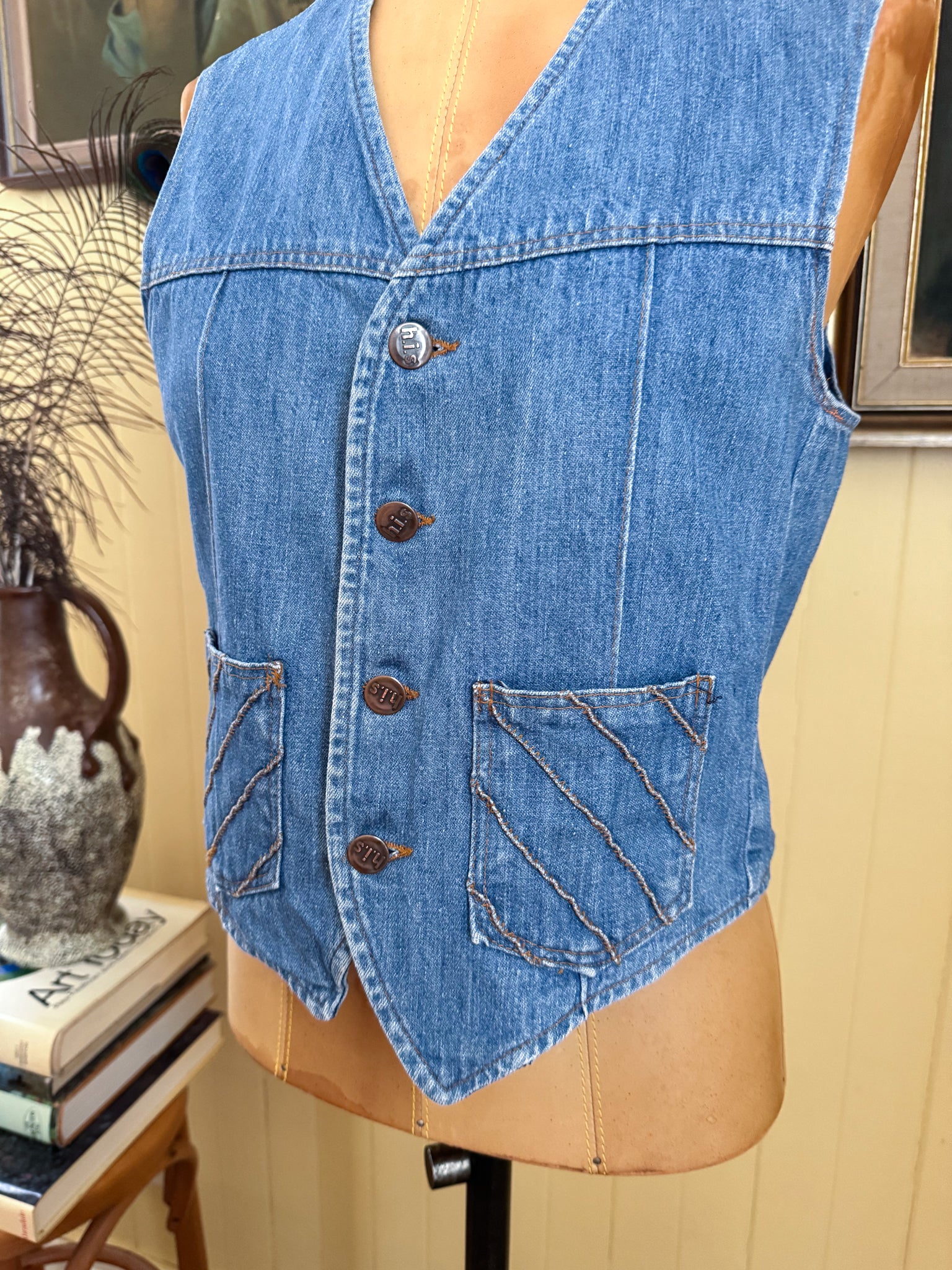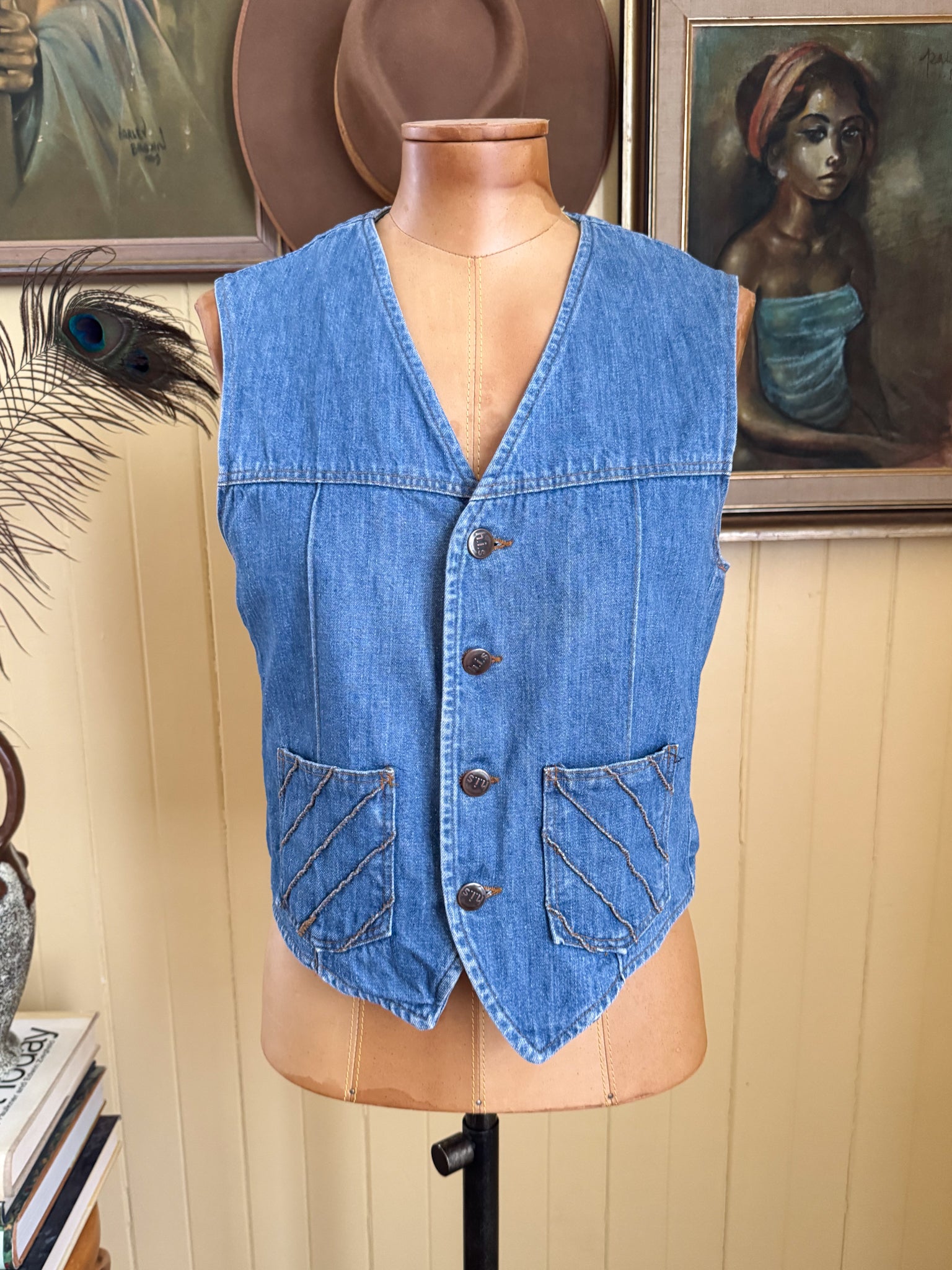VINTAGE 1970S H.I.S. COTTON DENIM POCKET WAISTCOAT VEST S/M