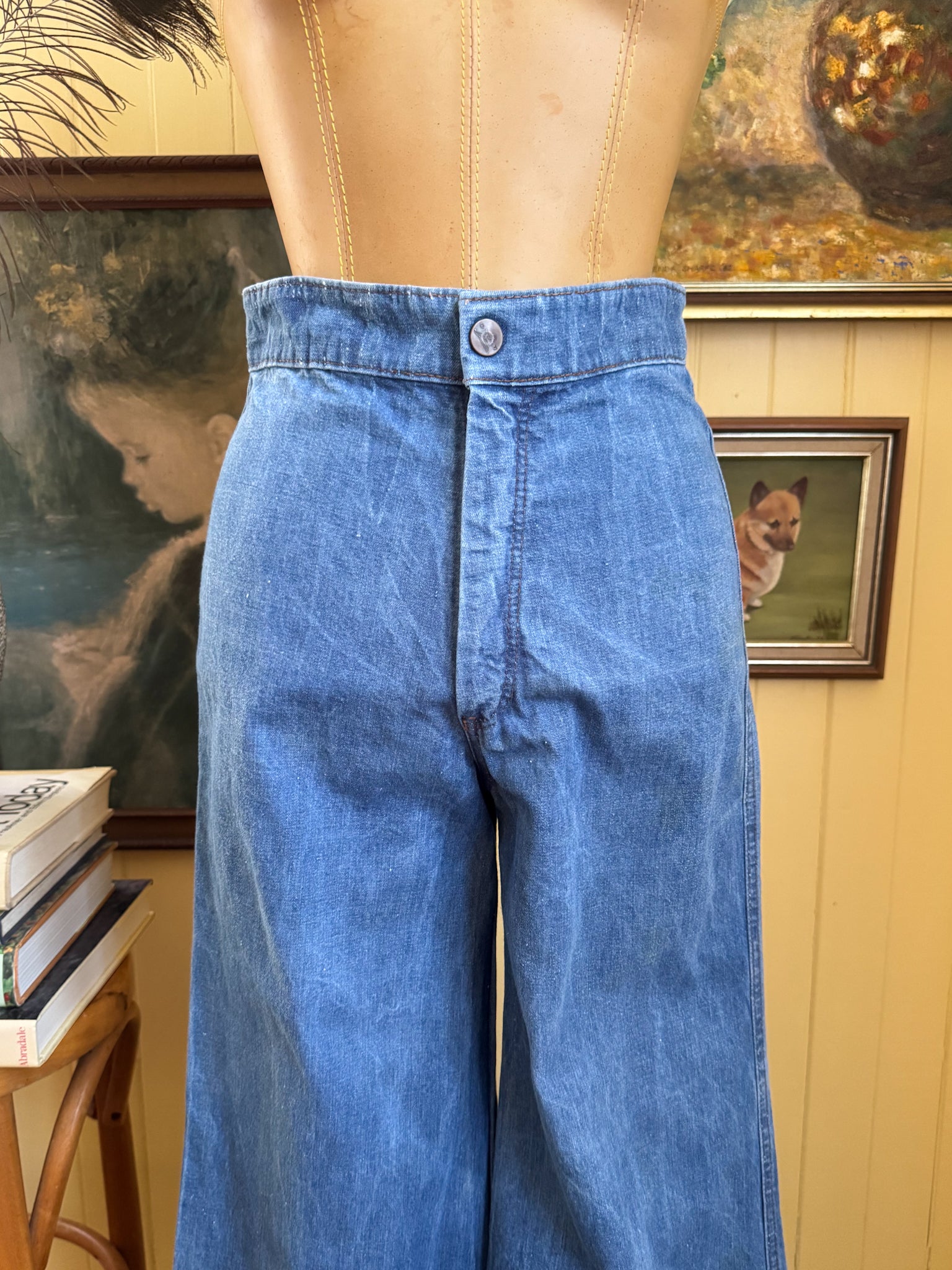 Is there anything more elusive than the holy grail of vintage jeans, the perfect 70s high waisted, butt enhancing, wide leg denim? Well, look no further than this groovy pair of original flares. Crafted in a mid weight cotton denim in a gorgeous blue wash, these babies have a super high waist, press stud and zip fastening, no pockets, are fitted around the butt and hips and the flares out into a flattering wide bellbottom leg.