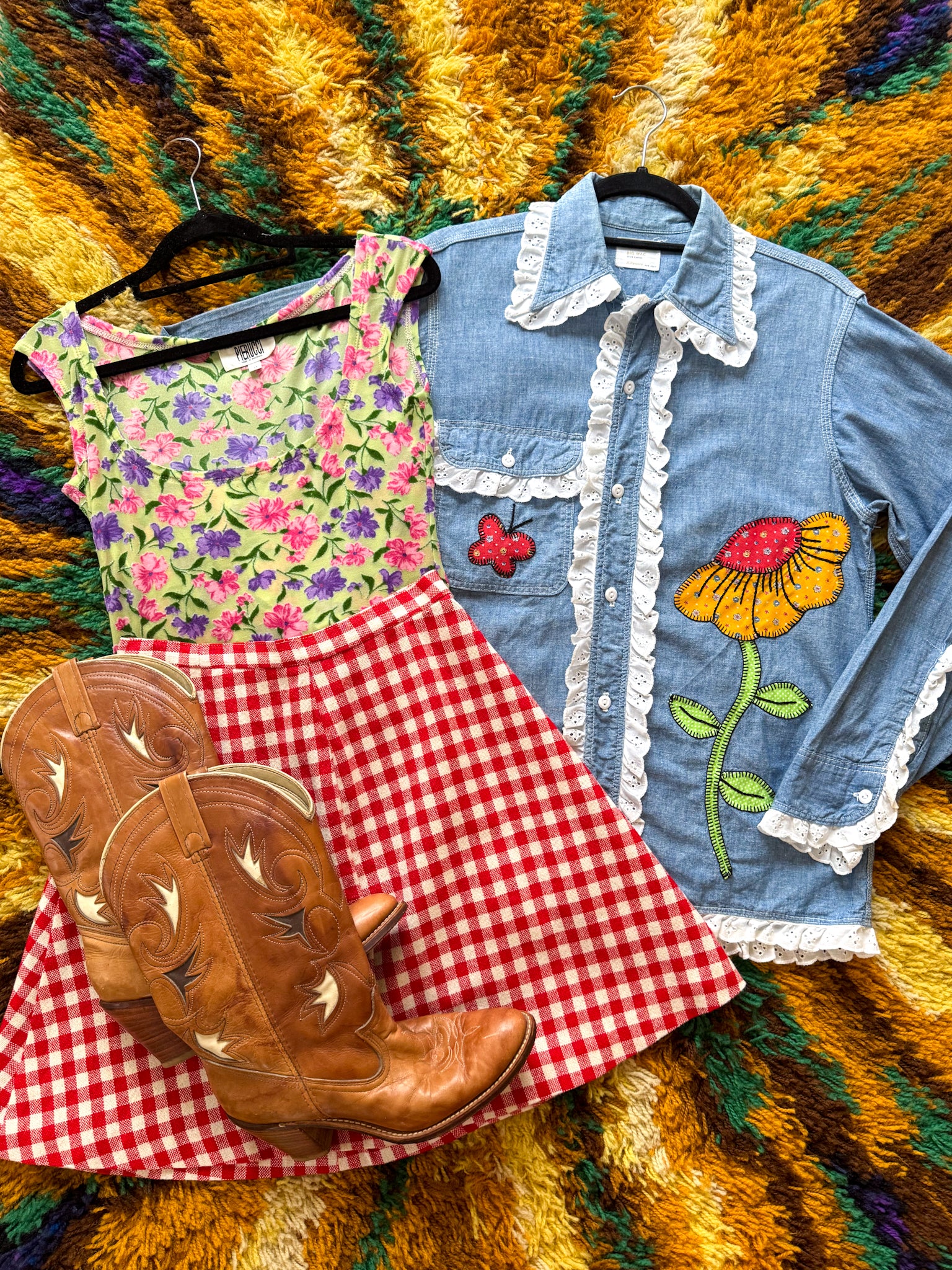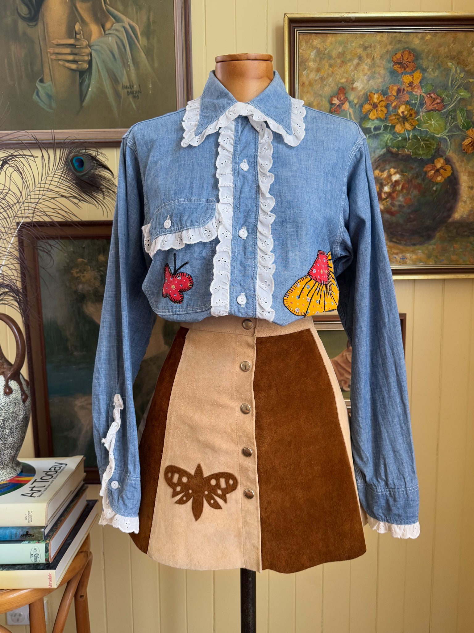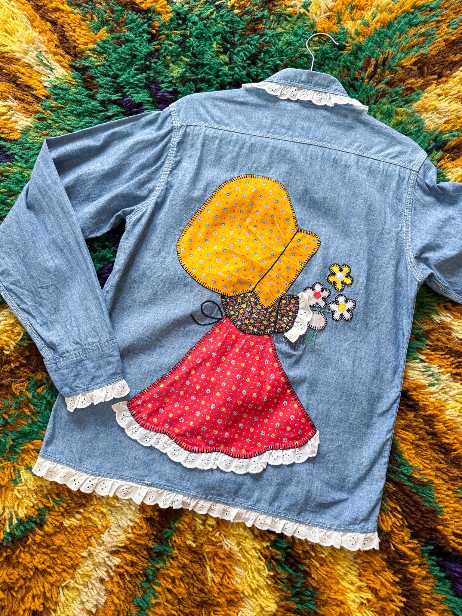 Possibly the sweetest lil applique blouse I've sourced. Crafted in the softest cotton chambray fabrication, this JC Penney American made 1970's shirt features a gorgeous butterfly, flower and Holly Hobby girl patchwork appliqué throughout. Button fastening front, collar, white lace broderie trims, button cuff sleeves, a front pocket and a boxy silhouette complete the look.