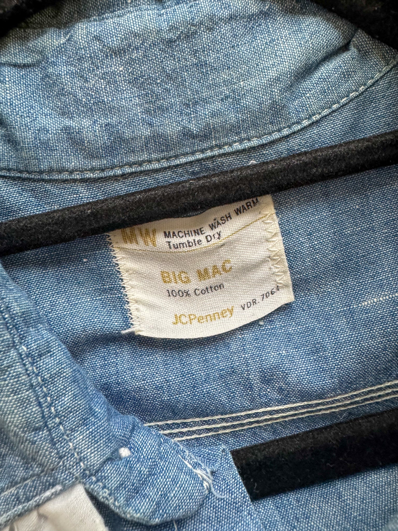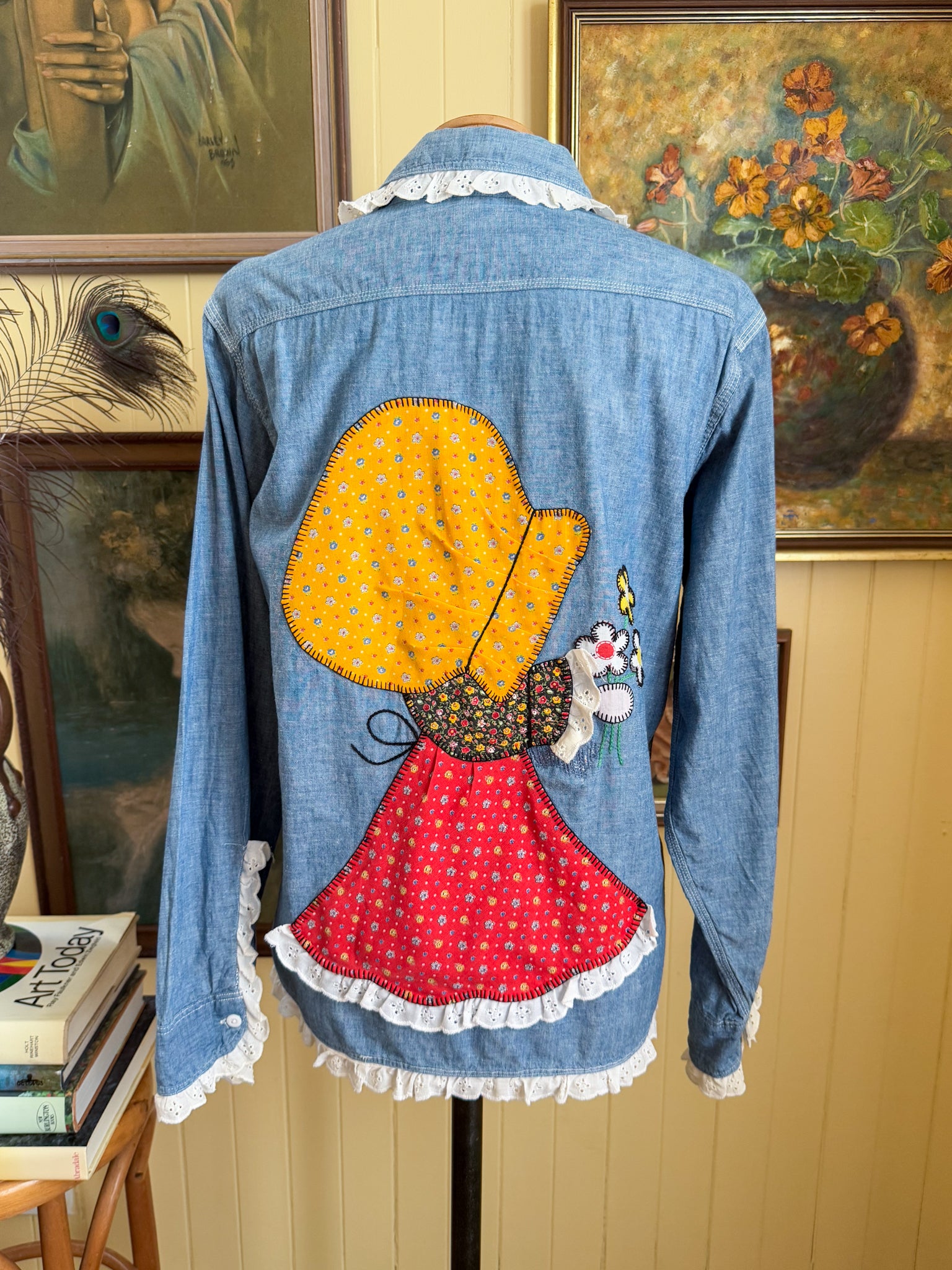 VINTAGE 1970S JC PENNEY COTTON CHAMBRAY APPLIQUÉ LACE TRIM SHIRT M