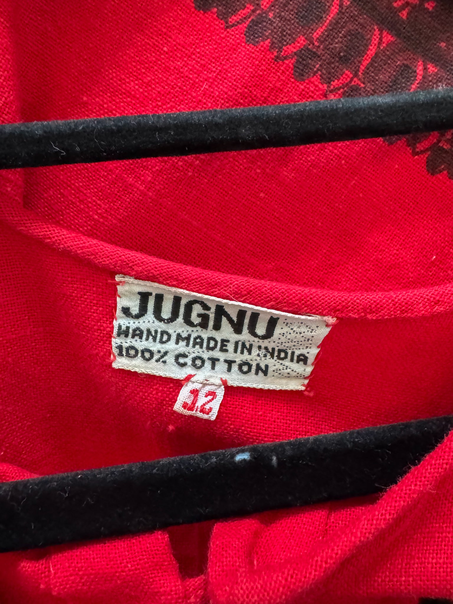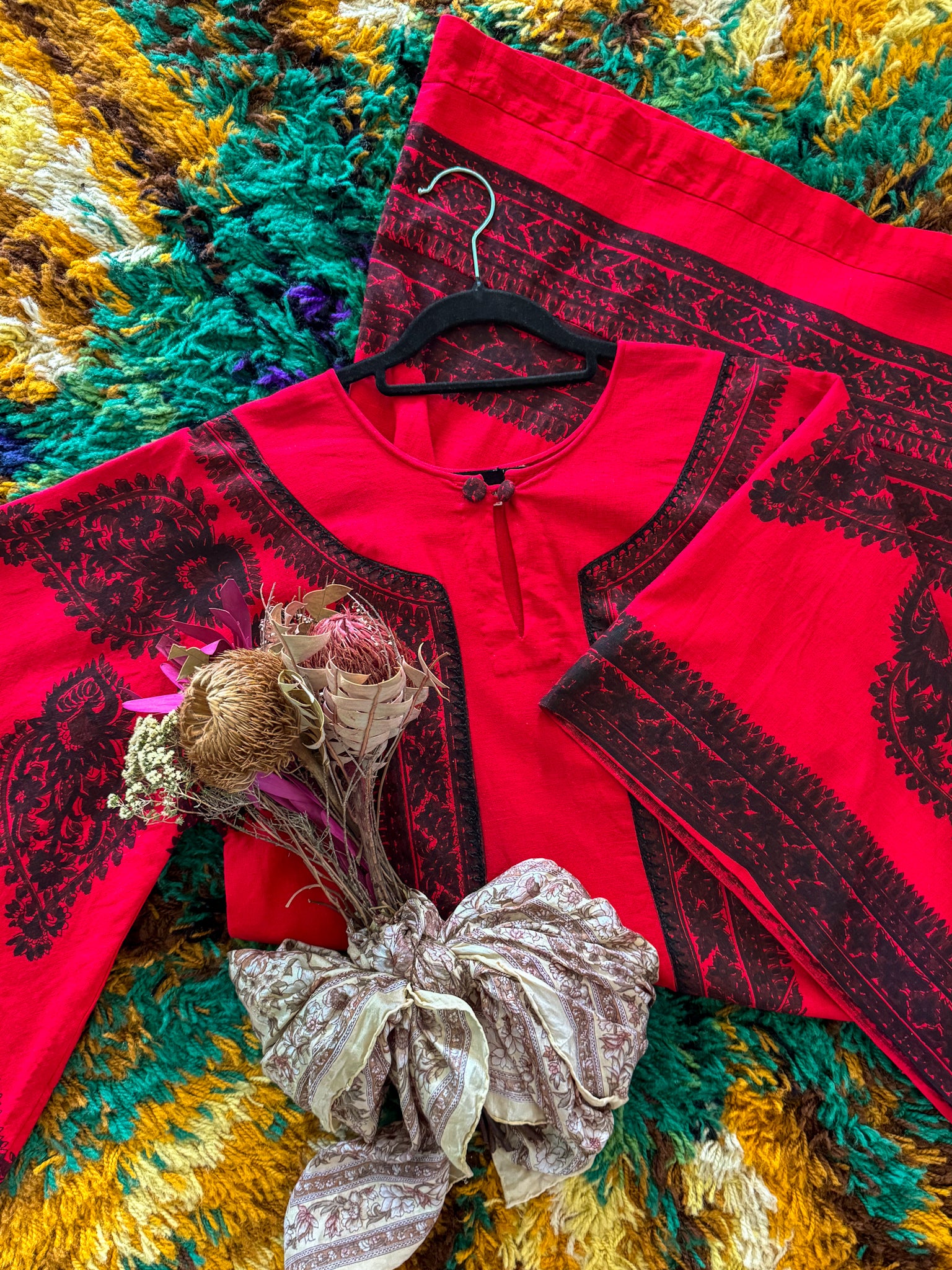 A true bohemian dream from the era when kaftan dressing reigned supreme. This 1970's regal beauty was hand crafted in India from 100% cotton in the most divine deep red hue, adorned with a black block print. Cropped angel sleeves, a high round neckline with toggle closure, relaxed a-line silhouette and shorter midi length complete the look.