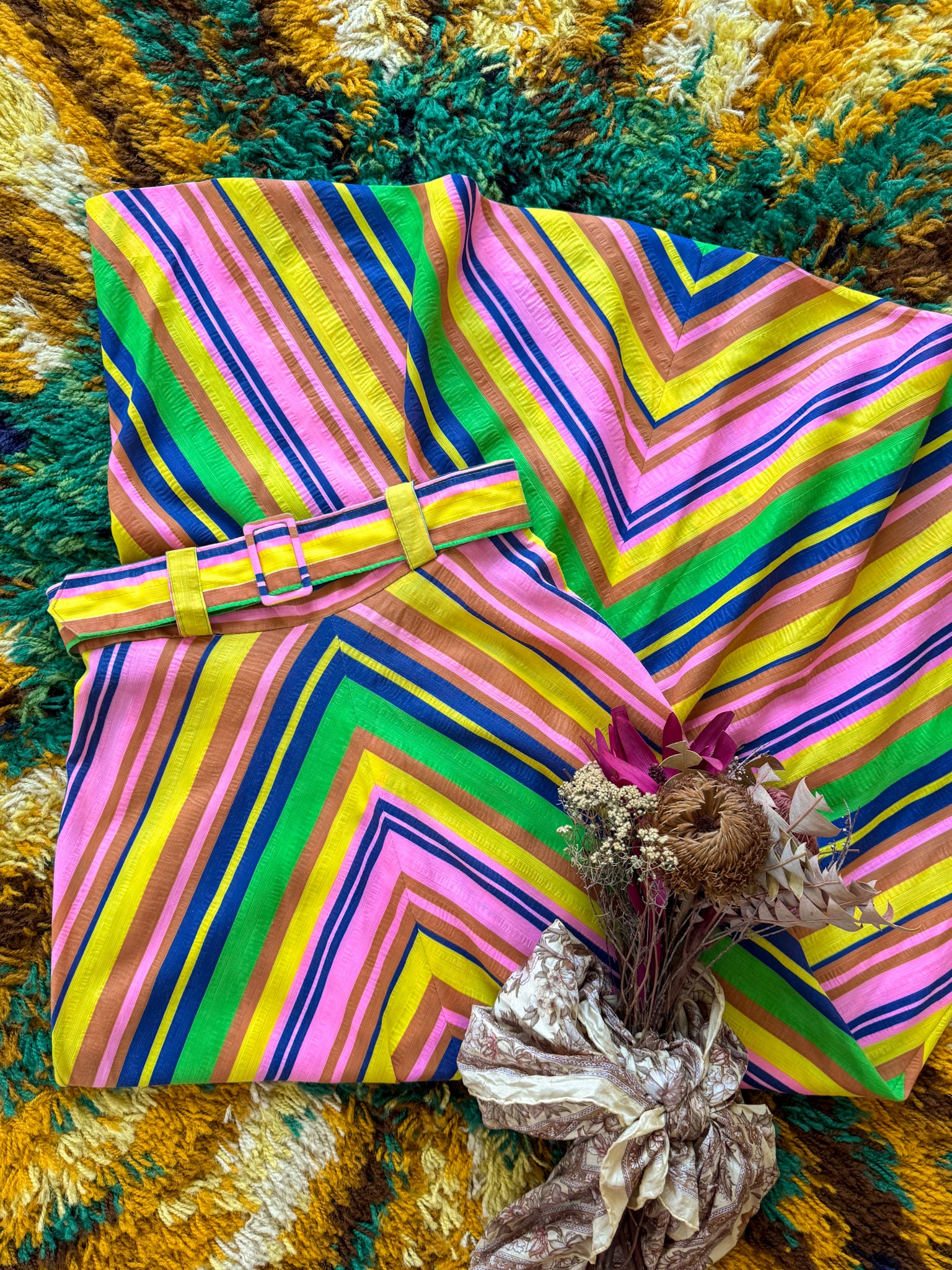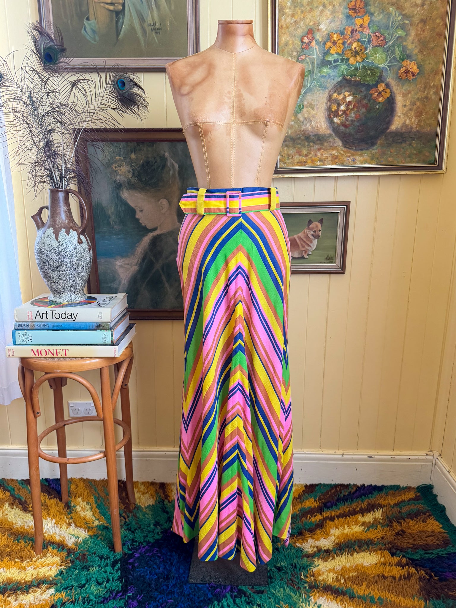 VINTAGE 1970S LONDON BOUTIQUE COTTON RAINBOW STRIPED BELTED MAXI SKIRT S/M