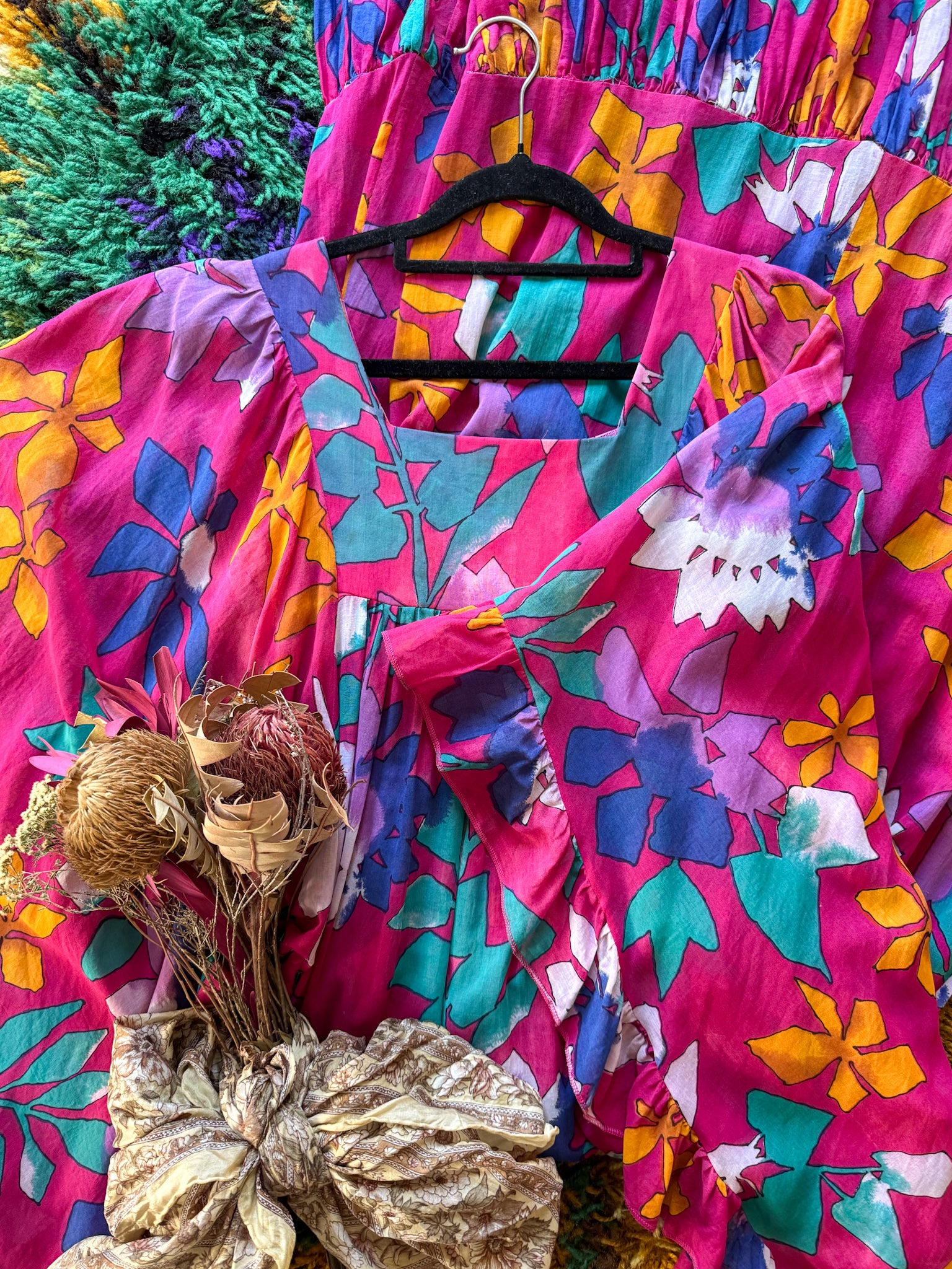 This is the most angelic goddess gown I’ve sourced in a long while. Crafted in a super light and floaty flat cotton gauze in a hot pink colourway, this free spirited Miss Jantzen Australian made dress features the sweetest oversized floral print throughout, a square neckline, super statement angel sleeves complete with ruffles and falls to an delicious maxi length. Magic.
