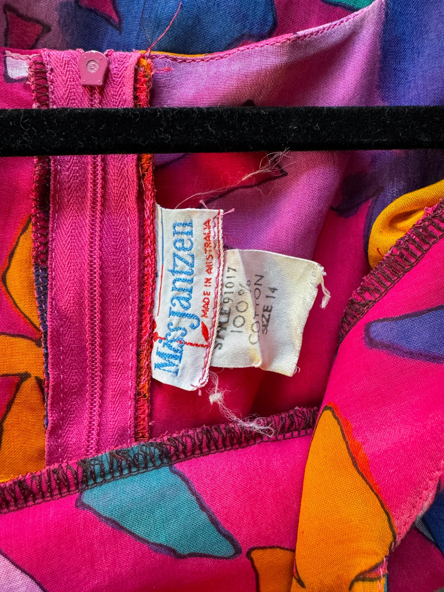 Tagged a vintage size 14, I would estimate this would be suitable for up to a S/M/L, it is quite flexible with sizing and would work on a modern 10/12/14 in AUS sizing depending on desired fit/measurements.