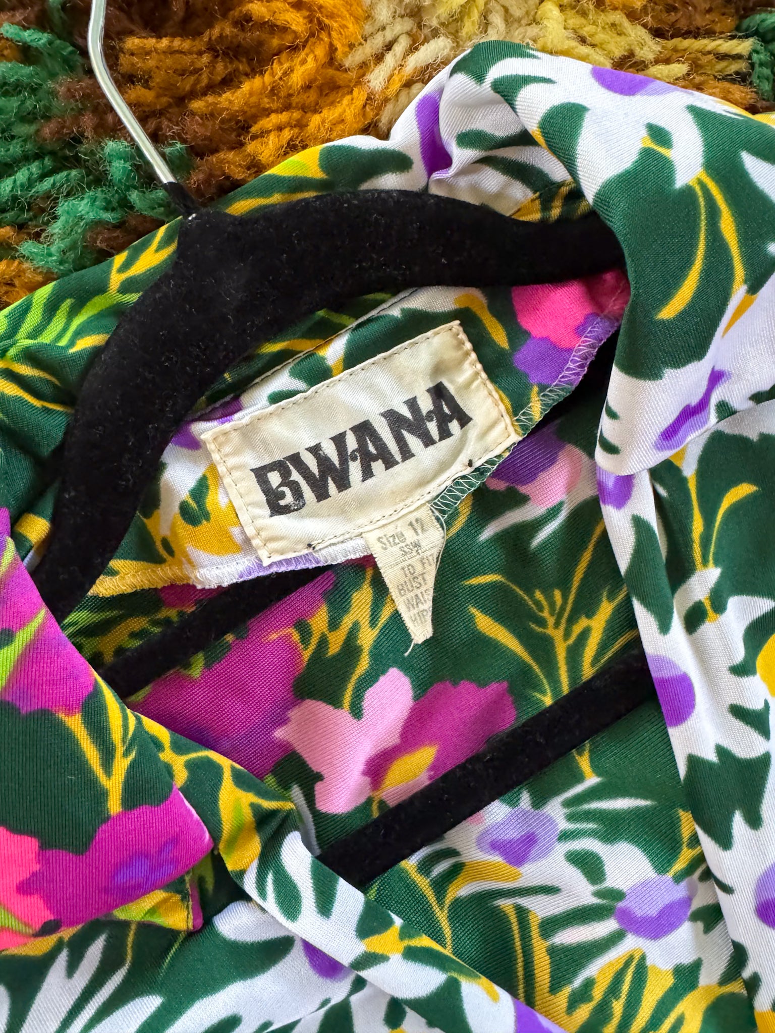 Introducing this ultra groovy two piece from 70s label Bwana. This divine duo features a cropped shirt top with dagger collar, full length sleeves and front tie up detail, paired back with a super long a-line maxi skirt with fixed waist. Both are cut in a lightweight fluid nylon fabrication in a psychedelic oversized floral print. Such a statement set.