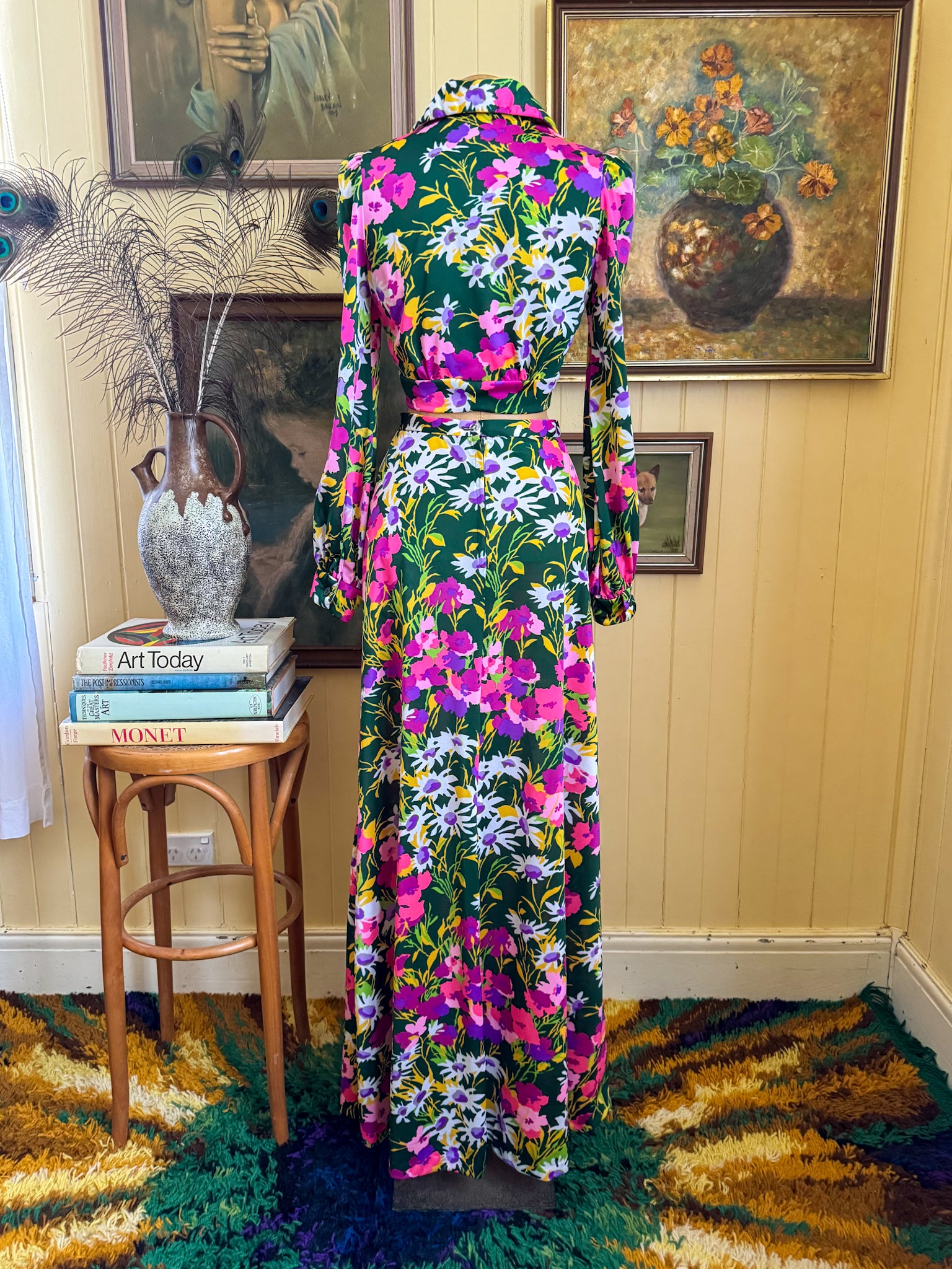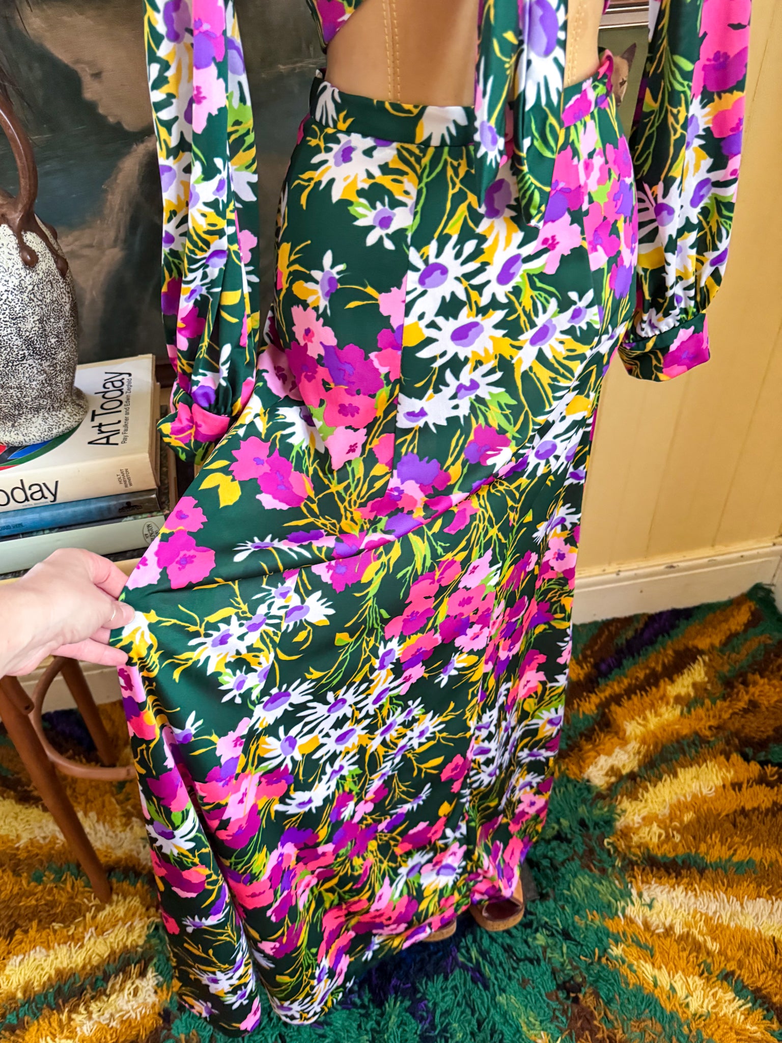 VINTAGE 1970S NYLON FLORAL PRINT TWO PIECE CROPPED BLOUSE + MAXI SKIRT SET XS