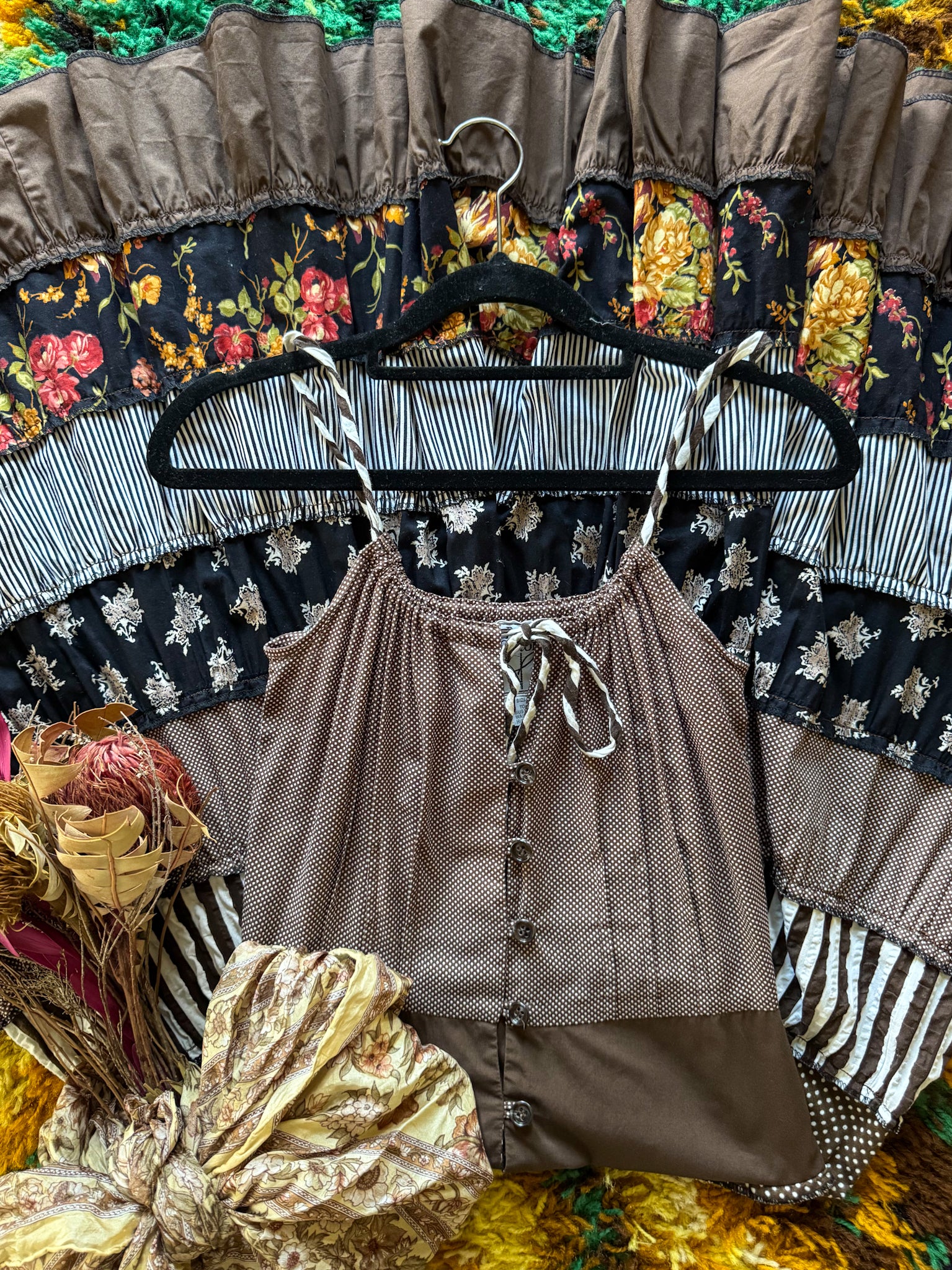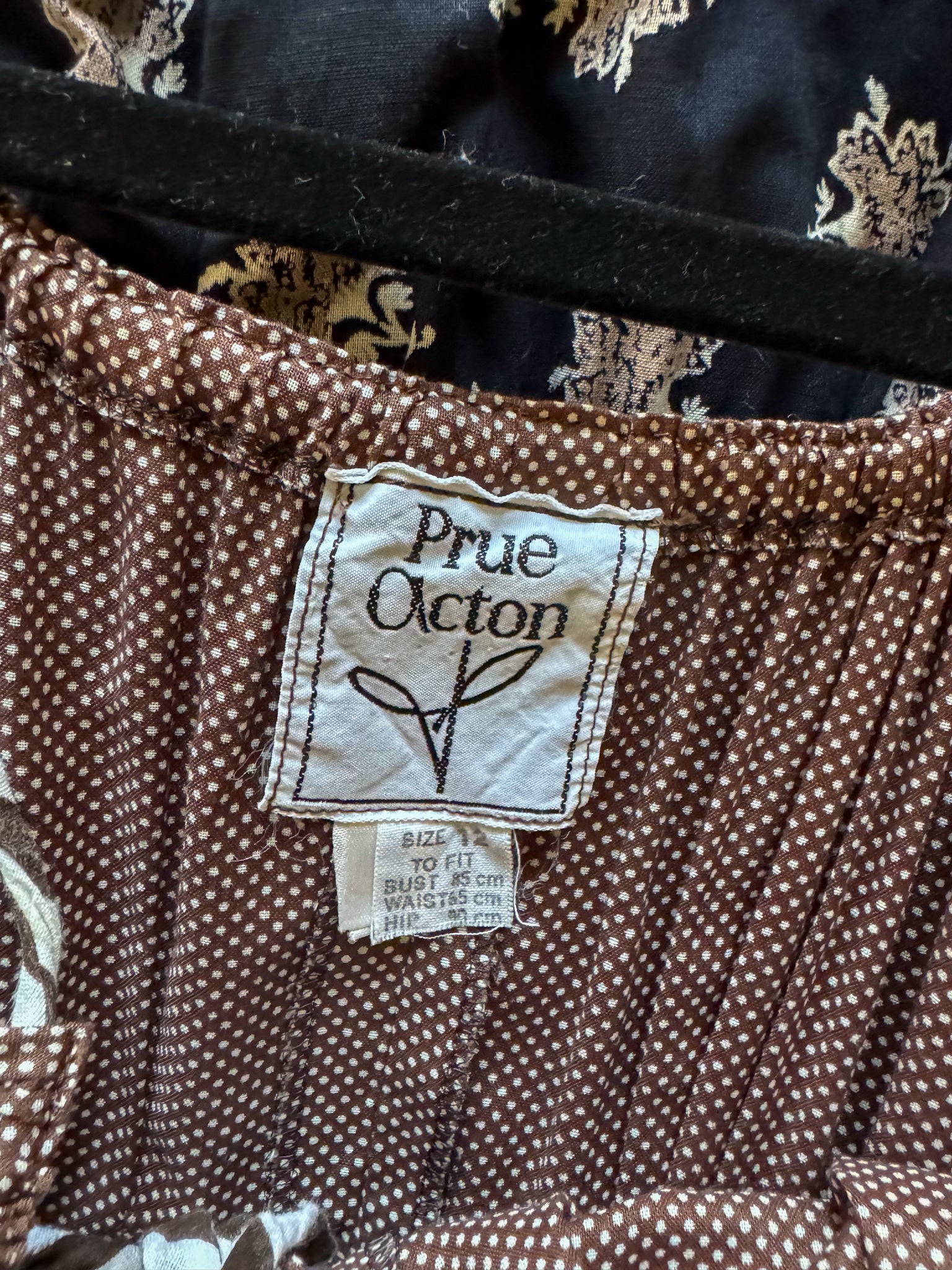 This 1970s Prue Acton designer label dream sun dress is crafted in a delightful mix of printed, striped and polka dot cottons across a chic brown, black and white colour palette. The dress features adjustable ribbon straps which tie at the front, a slightly fitted bodice that cascades out into a voluminous tiered midi length shirt. Also comes with an oversized waist belt or scarf.