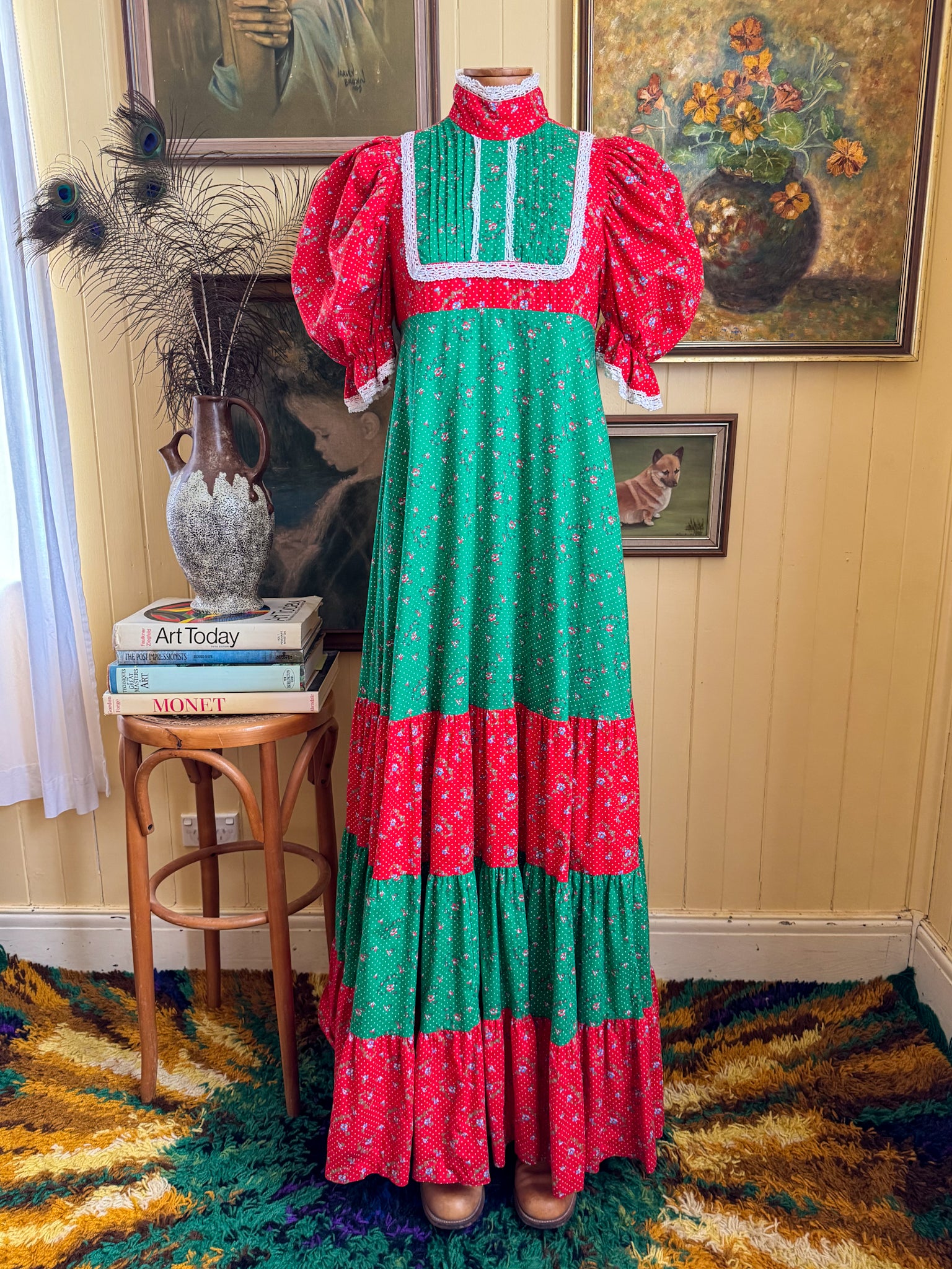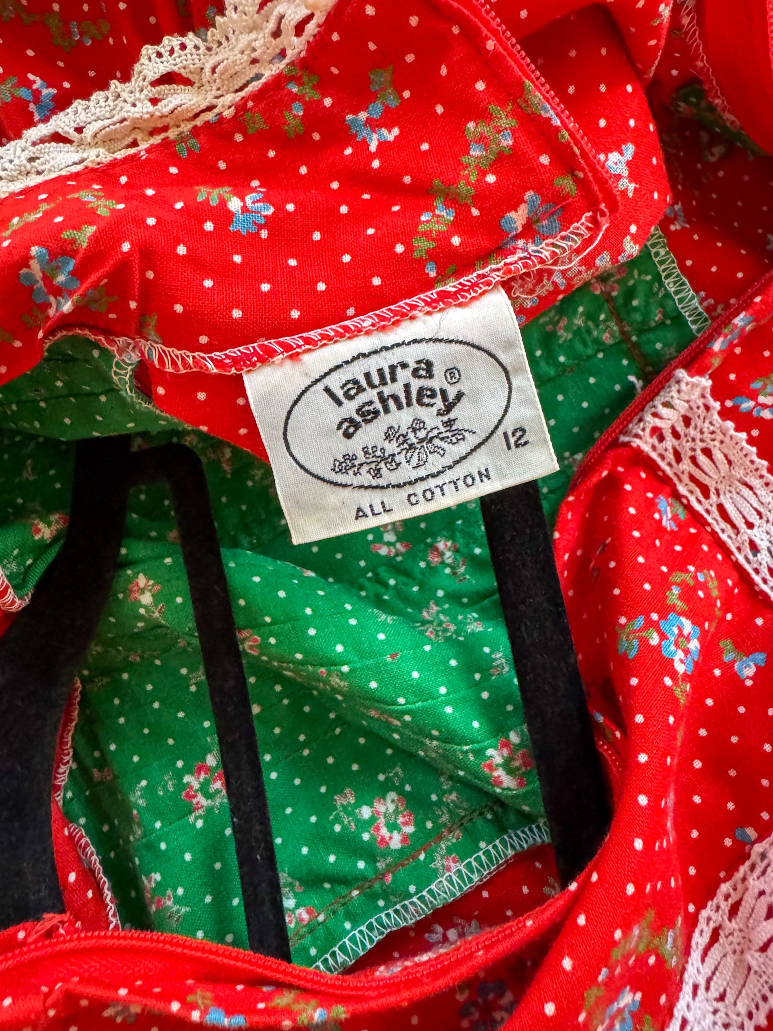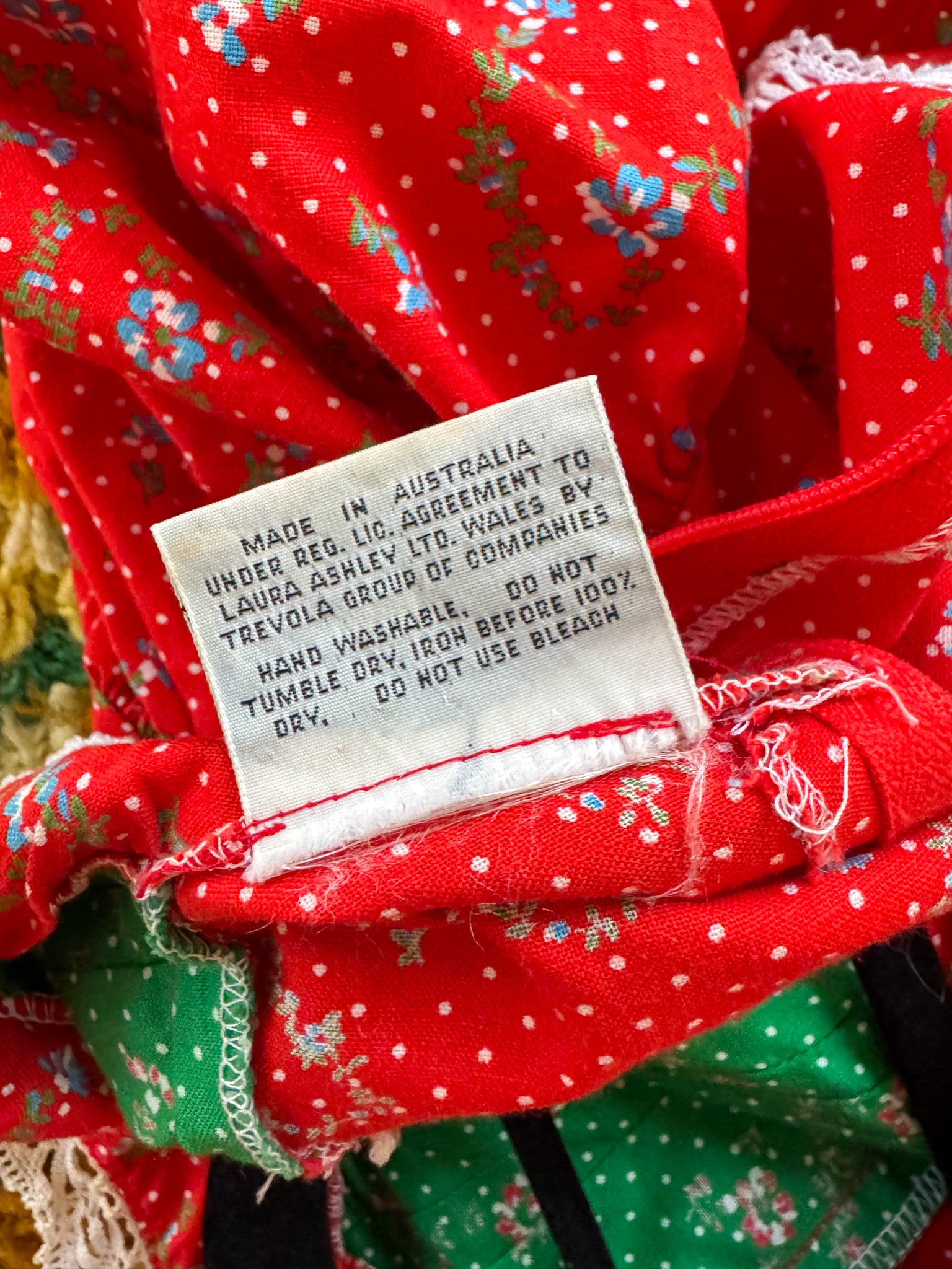 Oh, is there anything more divine than an original 1970’s Laura Ashley prairie dress? And then add a beautiful mix of floral prints and you’ve got one of the most special prairie dresses we’ve sourced to date. This one has all the beautiful feminine features, cut in a lovely lightweight cotton fabrication in a stunning red, green and white floral print. She features a Victoriana-style high neck with lace detail, the sweetest puff sleeves, a loose trapeze shape and falls to a voluminous maxi length skirt complete with ruffles. Such a rare and special beauty. She is cottagecore personified.