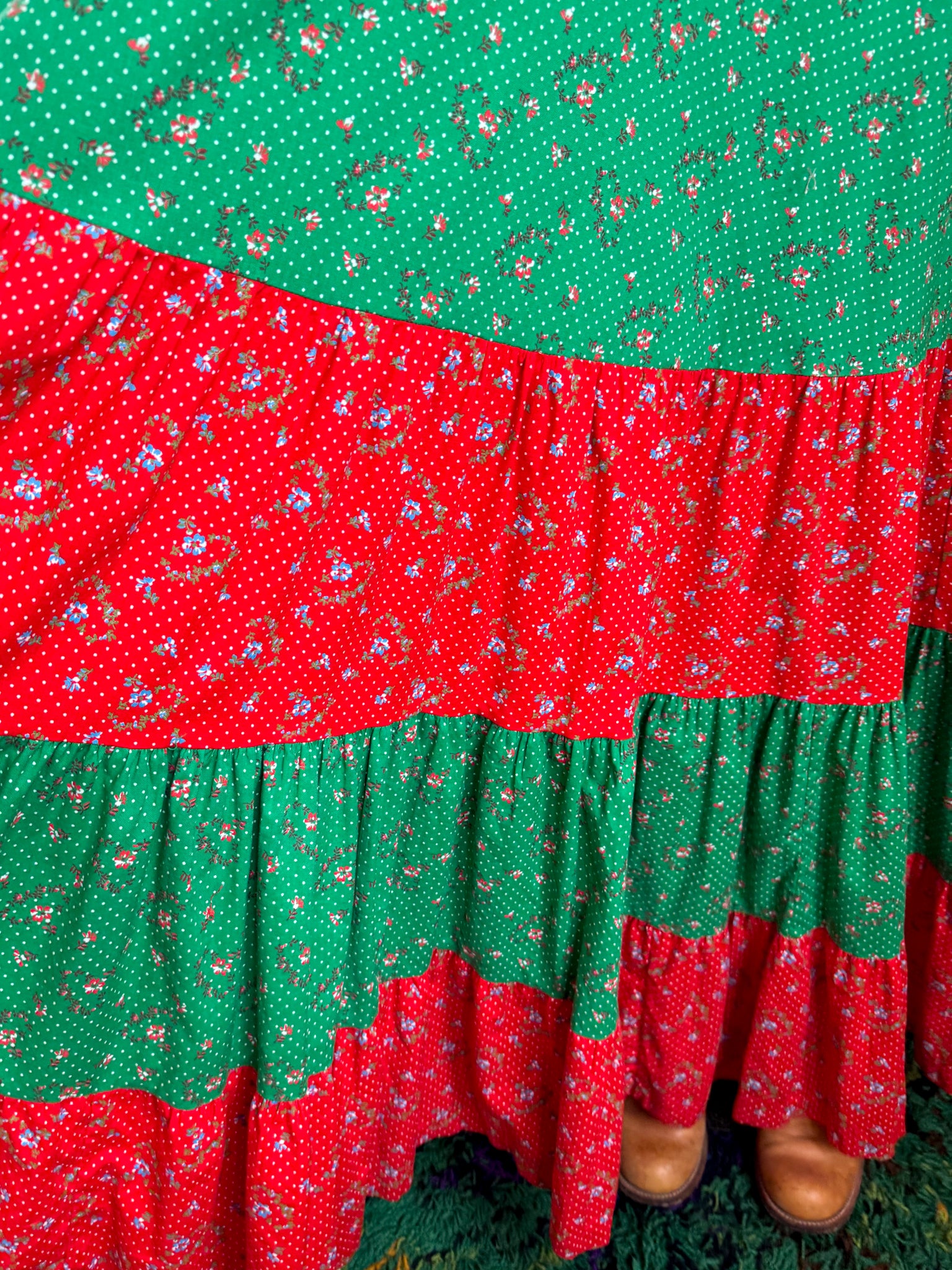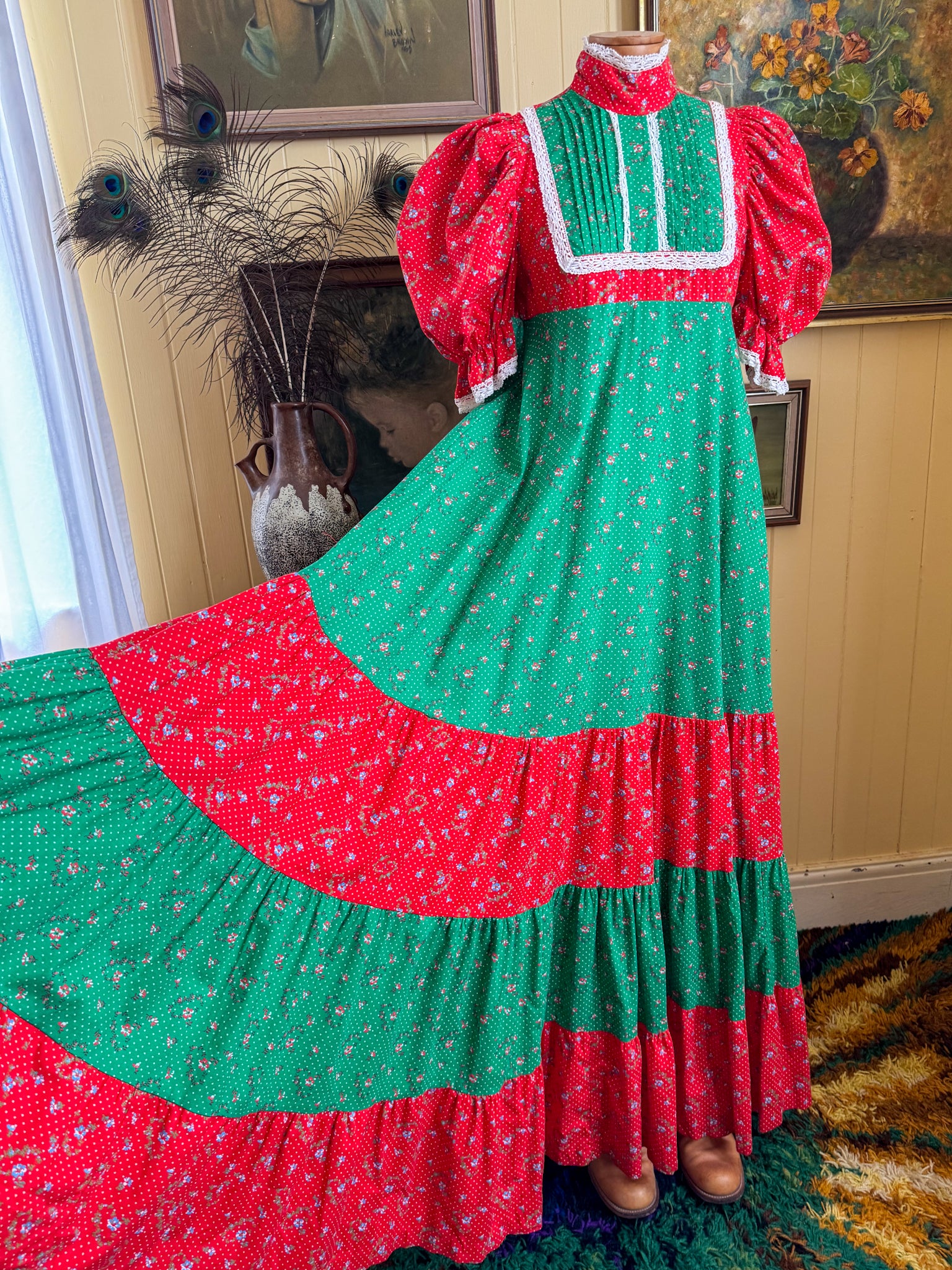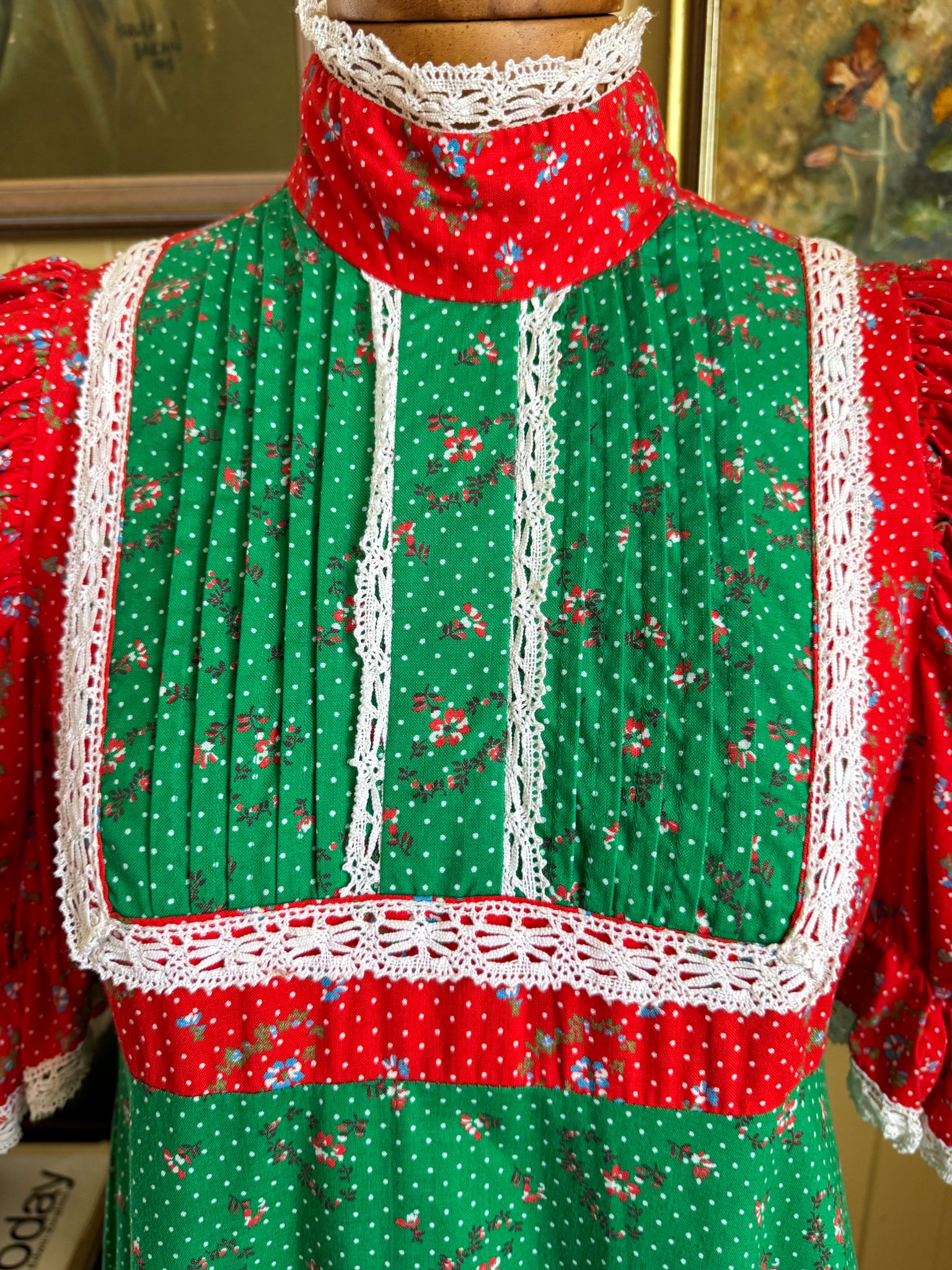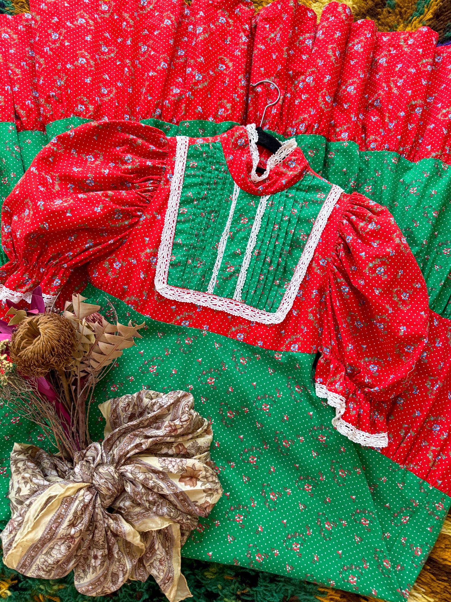 Oh, is there anything more divine than an original 1970’s Laura Ashley prairie dress? And then add a beautiful mix of floral prints and you’ve got one of the most special prairie dresses we’ve sourced to date. This one has all the beautiful feminine features, cut in a lovely lightweight cotton fabrication in a stunning red, green and white floral print. She features a Victoriana-style high neck with lace detail, the sweetest puff sleeves, a loose trapeze shape and falls to a voluminous maxi length skirt complete with ruffles. Such a rare and special beauty. She is cottagecore personified.