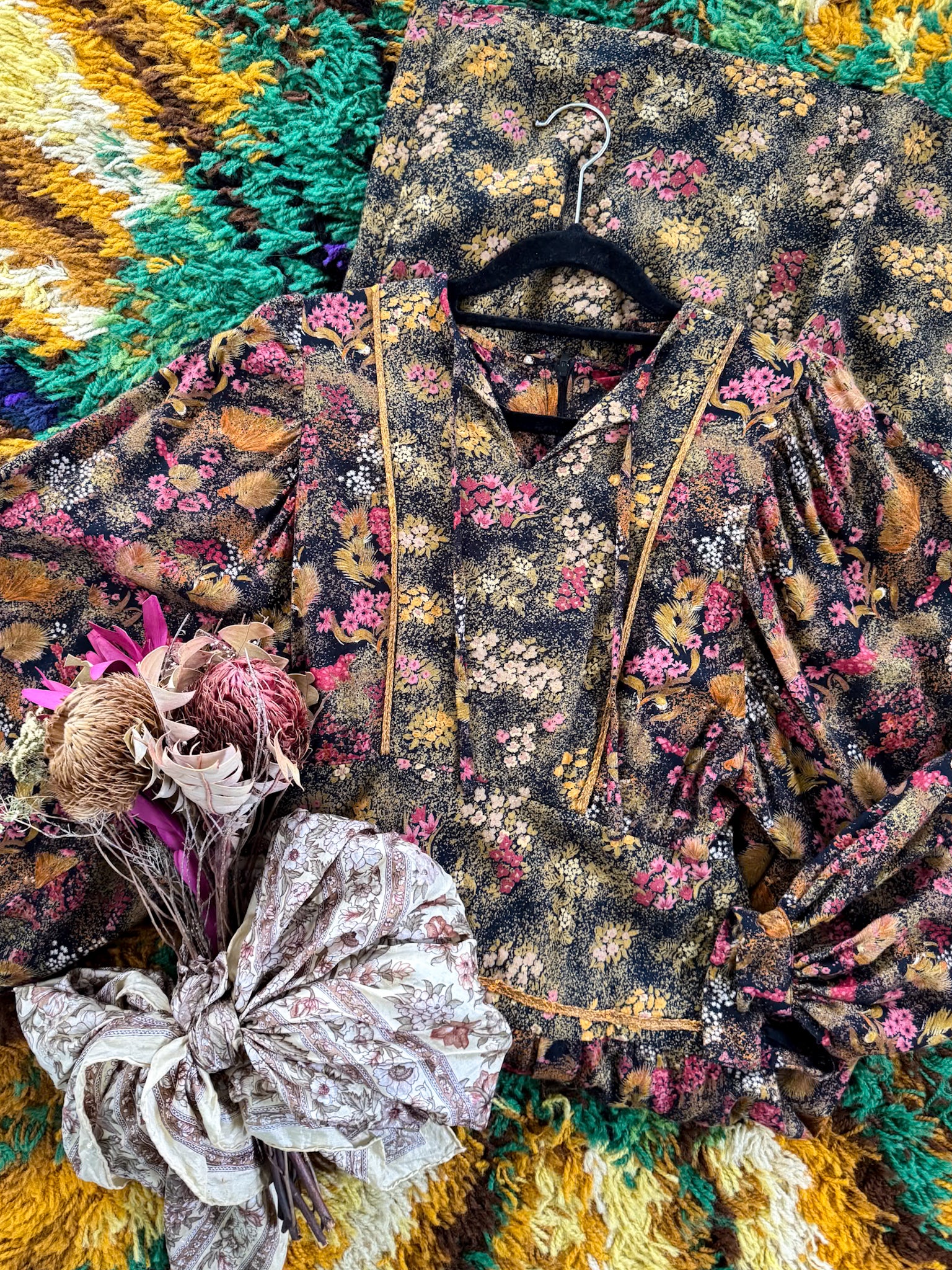 This is a beautifully feminine 1970’s prairie dress, she has no brand or labels but is very similar to an Origin dress I also have for sale. I’m guessing she’s made from a rayon fabrication as she has a lovely weight and drapes beautifully, and her autumnal floral print adds a mystical moodiness to her charm. Elbow length balloon sleeves with button cuffs, golden ribbon trimming, a fixed waist and a full, midi length skirt make her a must-have vintage wardrobe addition.